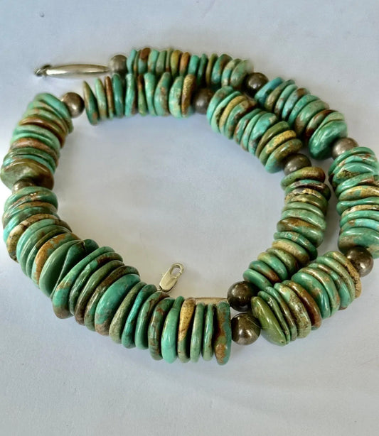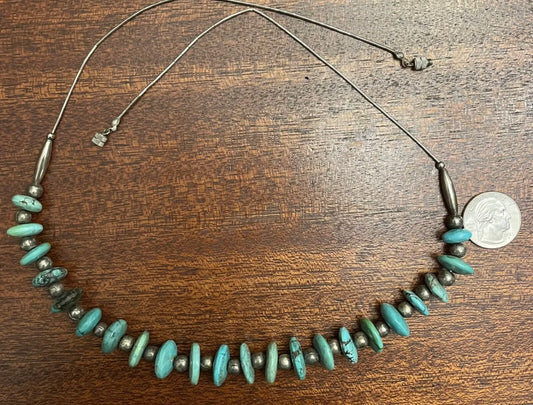 AUTHENTIC HANDMADE Vintage Navajo Pearls and Turquoise Graduated Saucer & Sterling Silver Bead Necklace 18”L