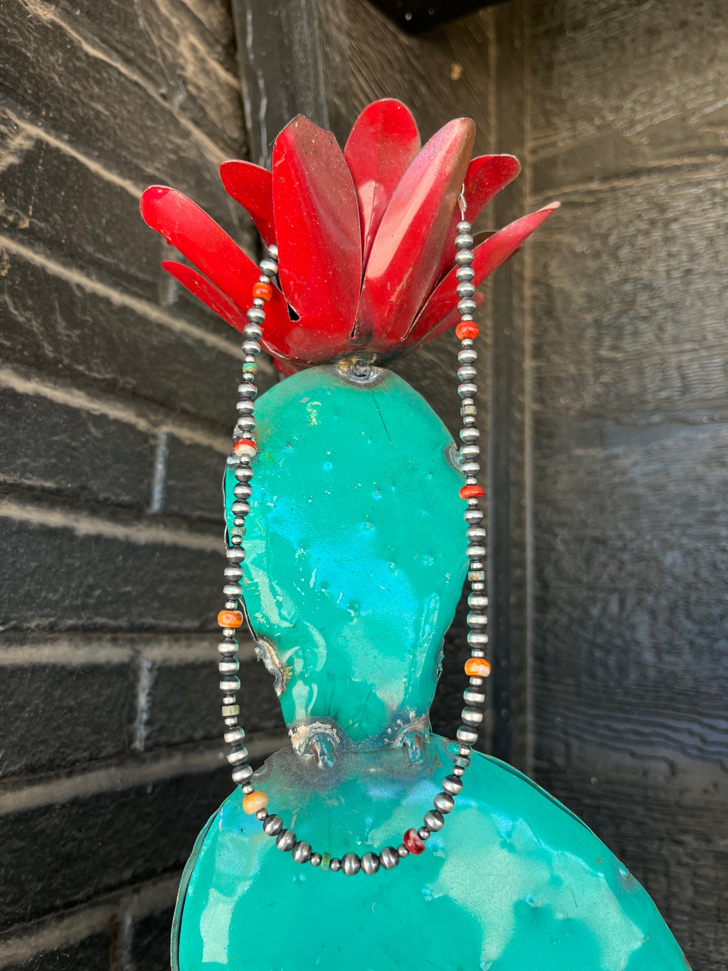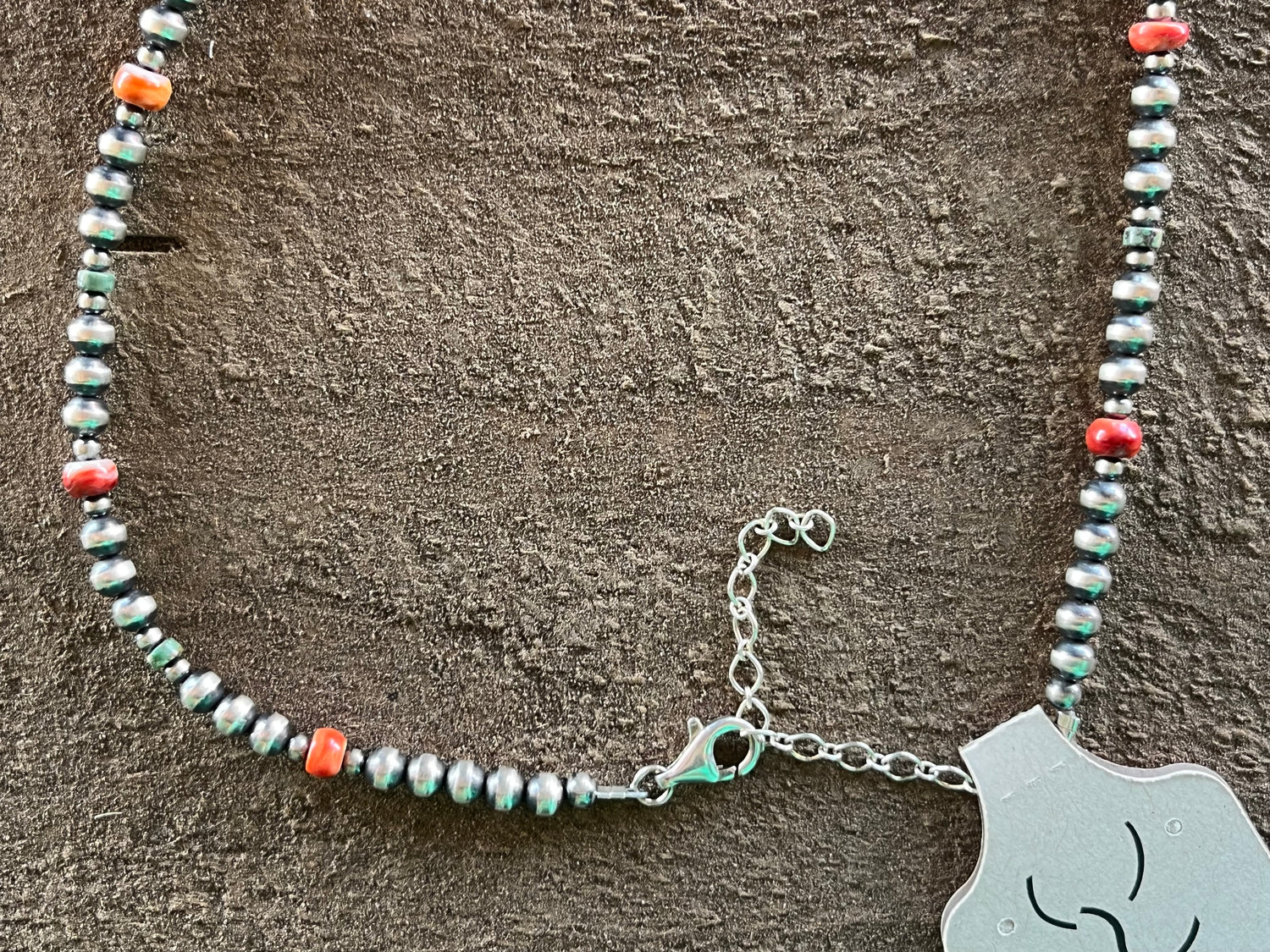 5mm Navajo pearl necklace with turquoise, red, orange, and purple spiny oyster throughout. Measures 15” + 3” extender.