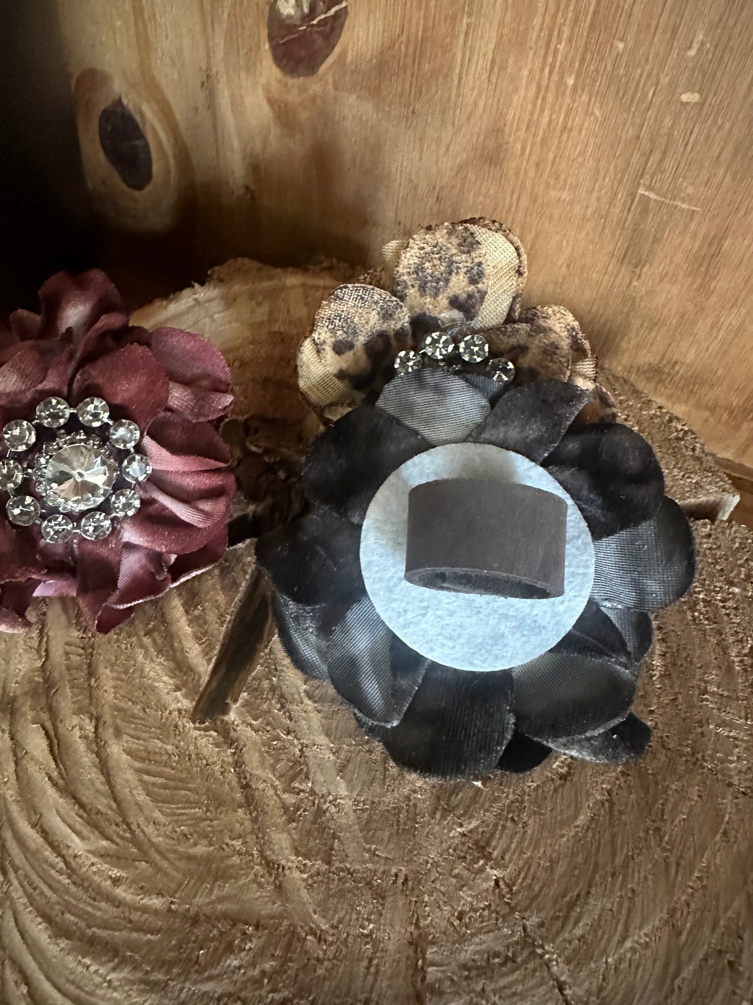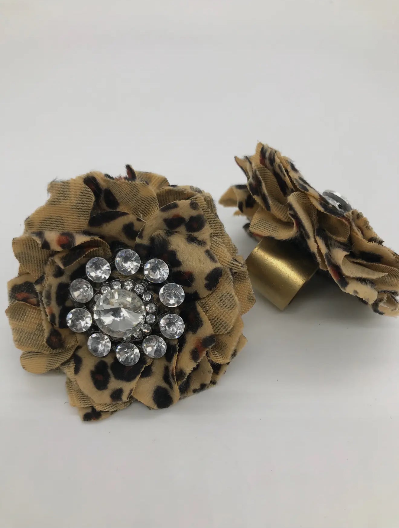 Hand-made and dyed vintage 2" Leopard Velvet Flower embellished with a large vintage button. Each piece is always unique and one-of-a-kind, perfect for rags!