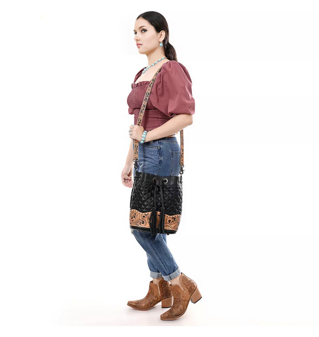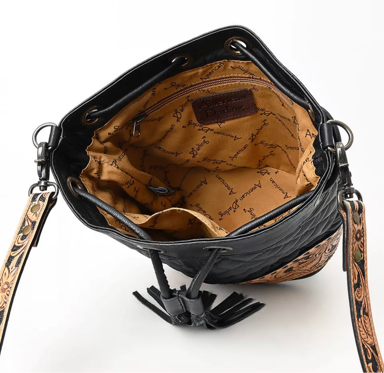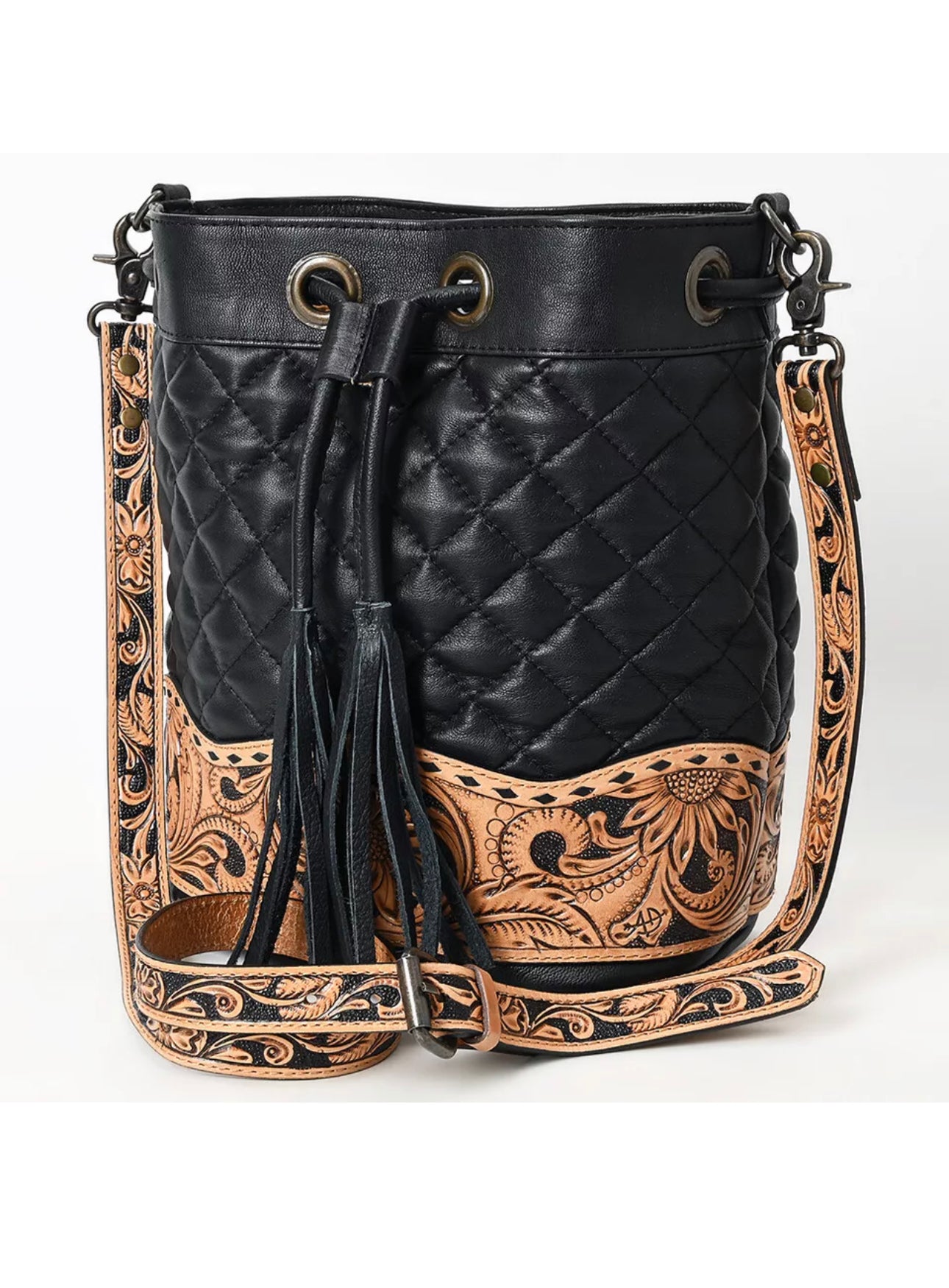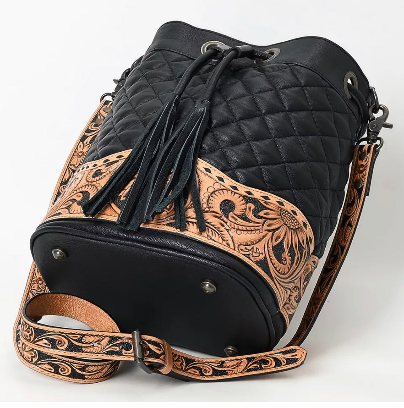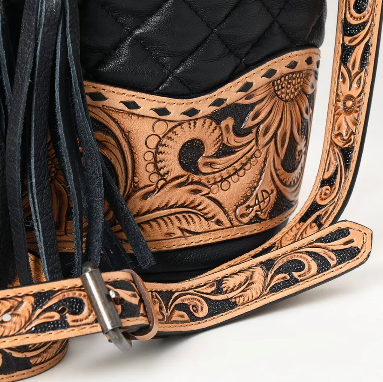 American Darling - Black Quilted Bucket Hand Tooled Genuine Leather Women Bag