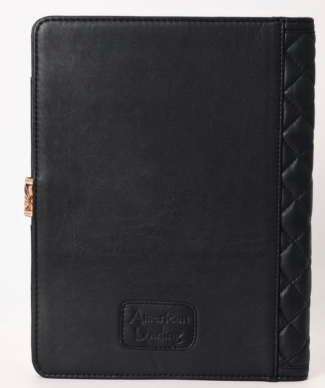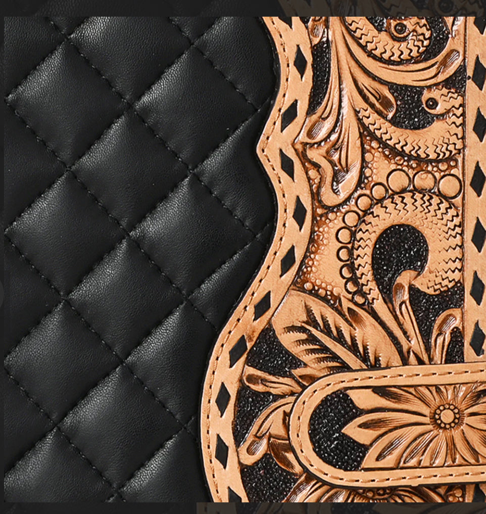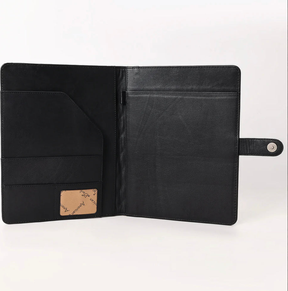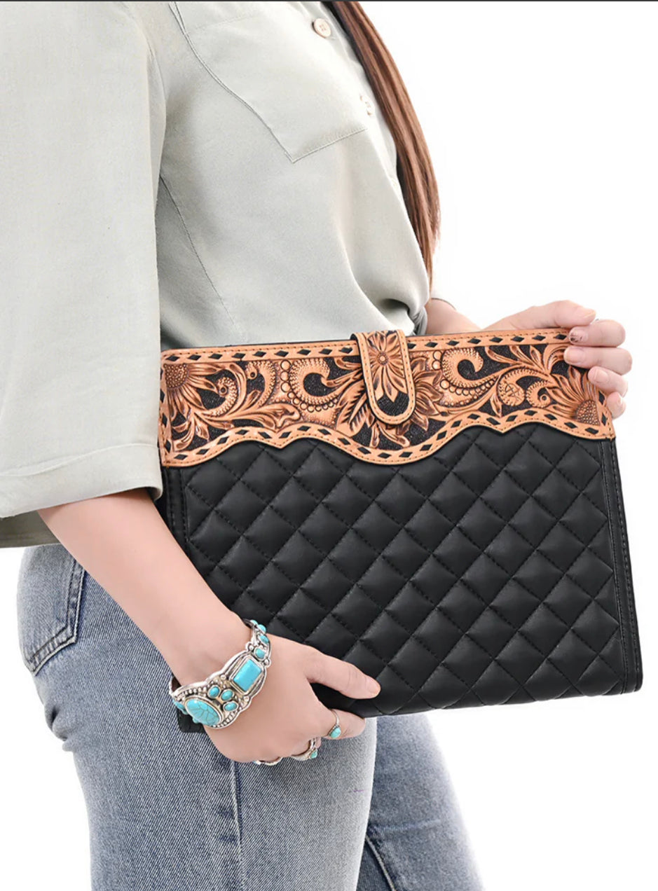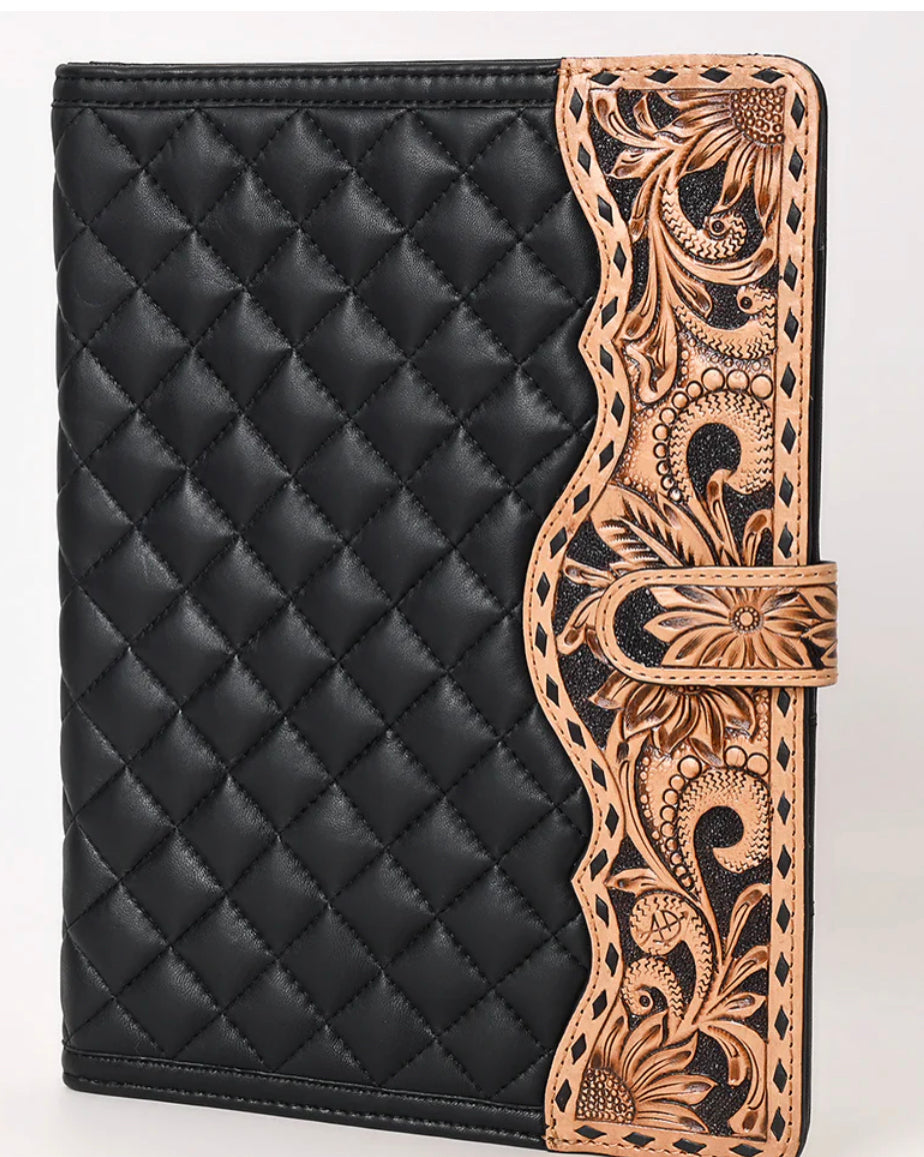American Darling - Black Quilted Portfolio Hand Tooled Genuine Western Leather Women Bag