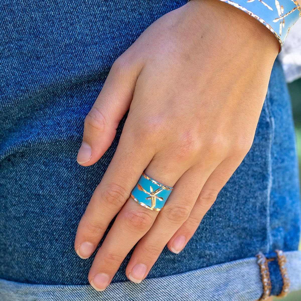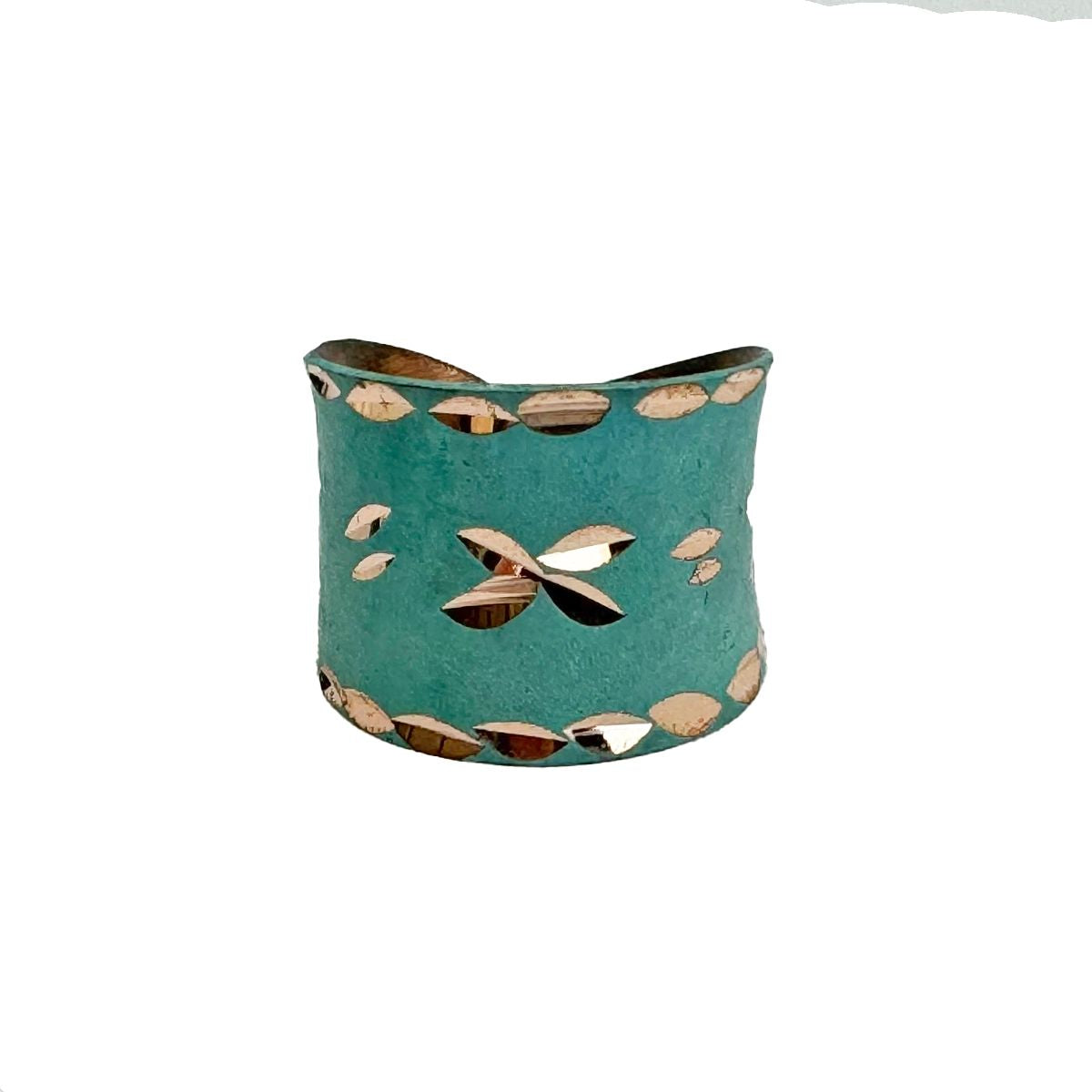 The Blooming Waters Ring is a stunning handcrafted piece made in India, featuring a vibrant aqua enamel finish adorned with intricate flower cutouts. This enchanting cuff beautifully blends artistry and nature, symbolizing renewal and growth. The refreshing aqua color adds a serene touch to any outfit, making it a perfect accessory for both casual and formal occasions. Expertly crafted by skilled artisans, each cuff showcases unique detailing, celebrating the beauty of handmade craftsmanship. Elevate your jewelry collection with the Blooming Waters Ring from the Patina Collection, a delightful expression of elegance and creativity. Each piece is handcrafted from copper and coated with a colored enamel.