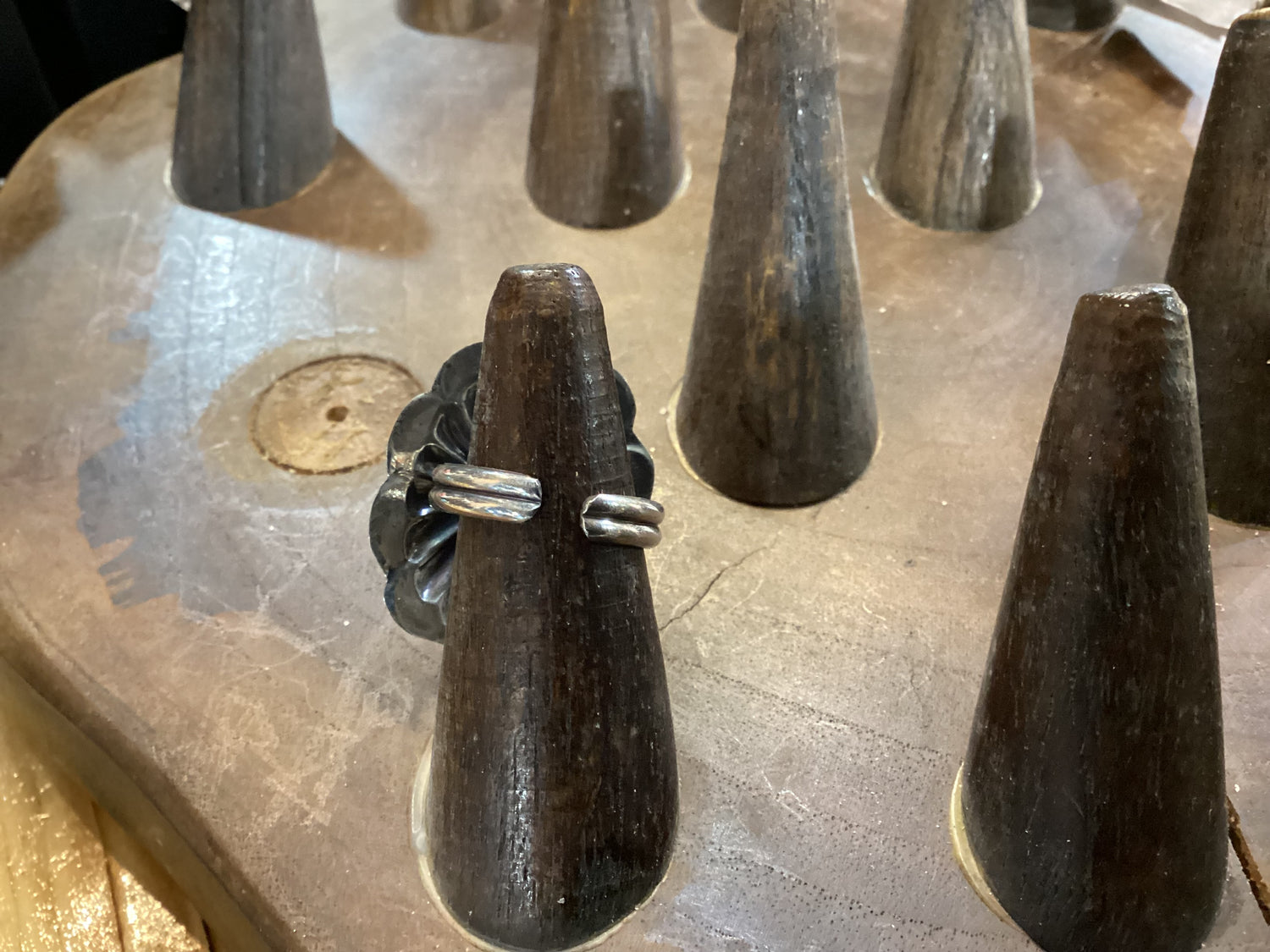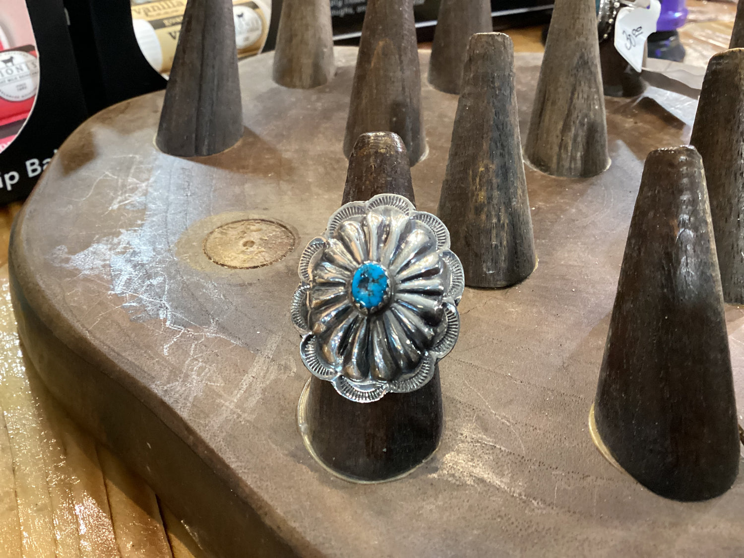 This sterling silver and turquoise Concho ring fits any size and is the perfect statement piece for any outfit! Hand crafted by Navajo artist Joan Begay.