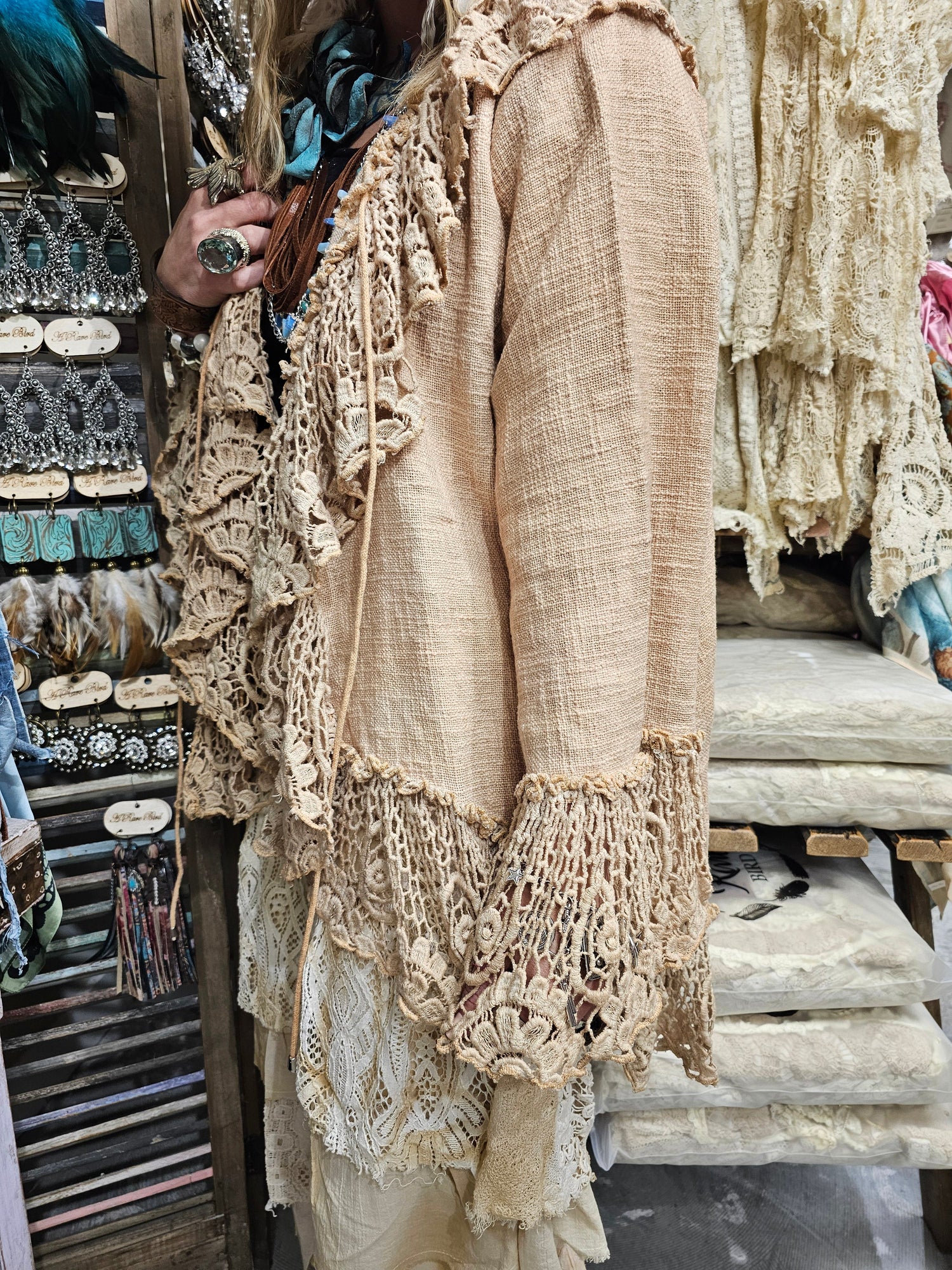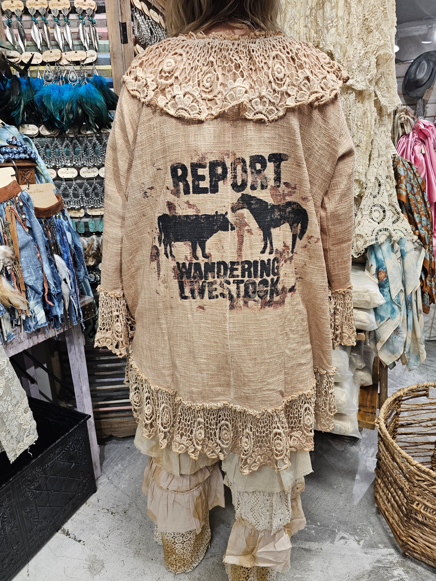 OMG! This one of a kind soft to the touch burlap jacket is so incredible. The distressed WANDERING LIVESTOCK on the back create such a fun vibe! Pairs well with all of the RARE BIRD pants and jeans.