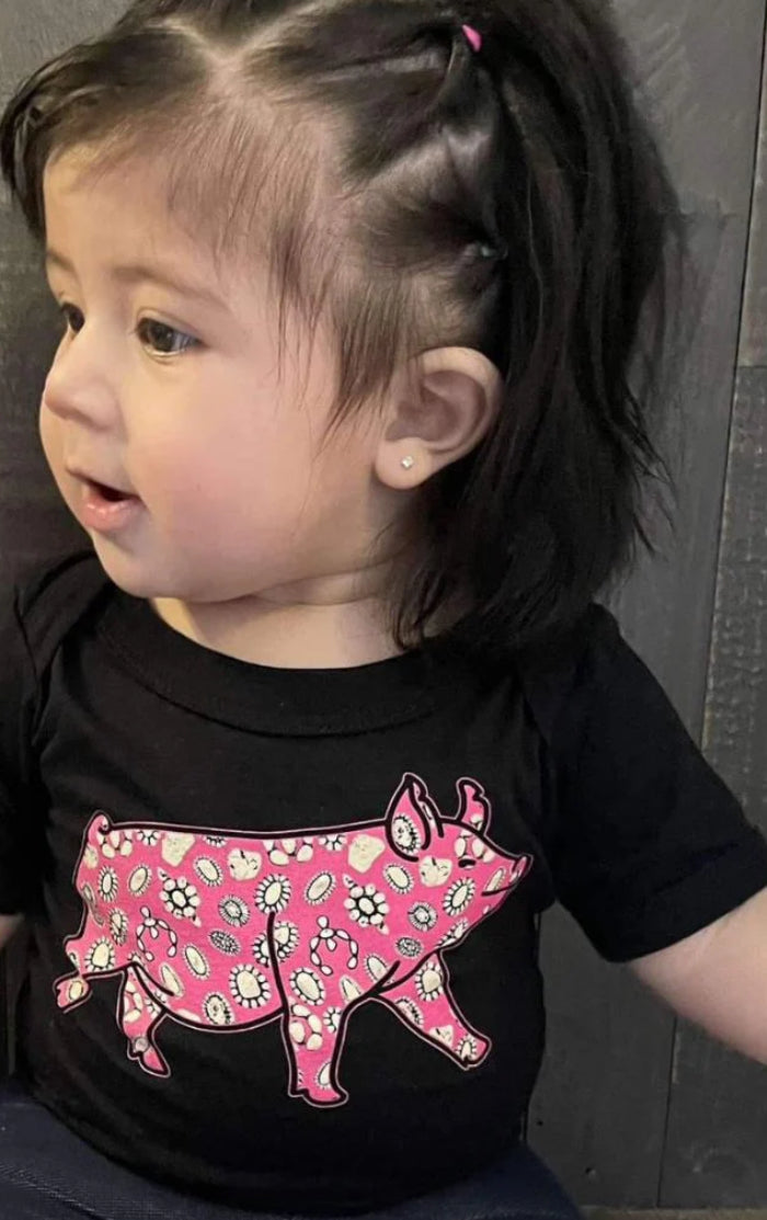 Get your little one ready for the rodeo with this adorable Concho Pig Baby onesie! Featuring a playful pink pig with a white concho-covered pick, this black onesie is perfect for your little cowboy or cowgirl. Yeehaw!