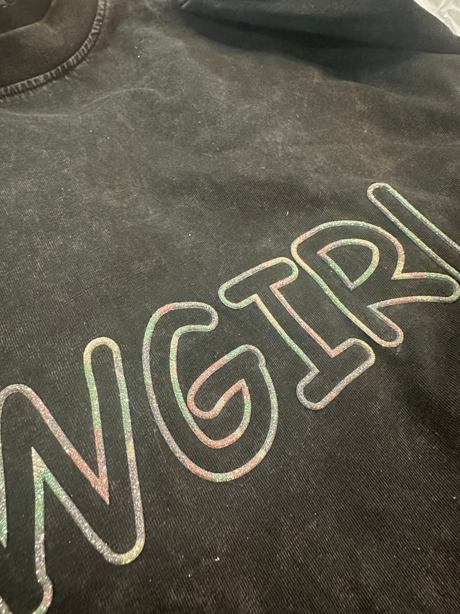 Where our cowgirls at? This super soft cotton mineral washed tee perfectly pops with metallic embellishment. Double needle stitched hem and raw edge sleeve.