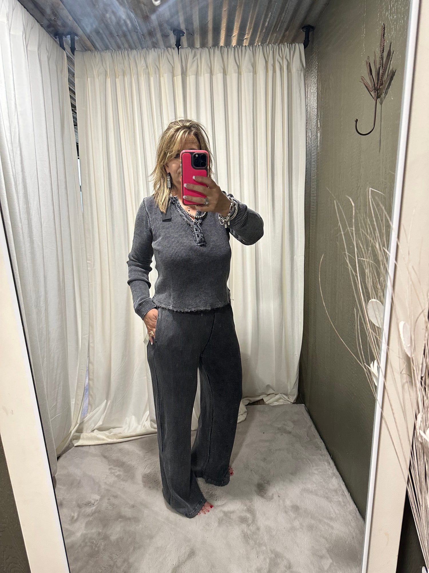 Distressed Mineral-Washed Long Sleeve Waffle Top