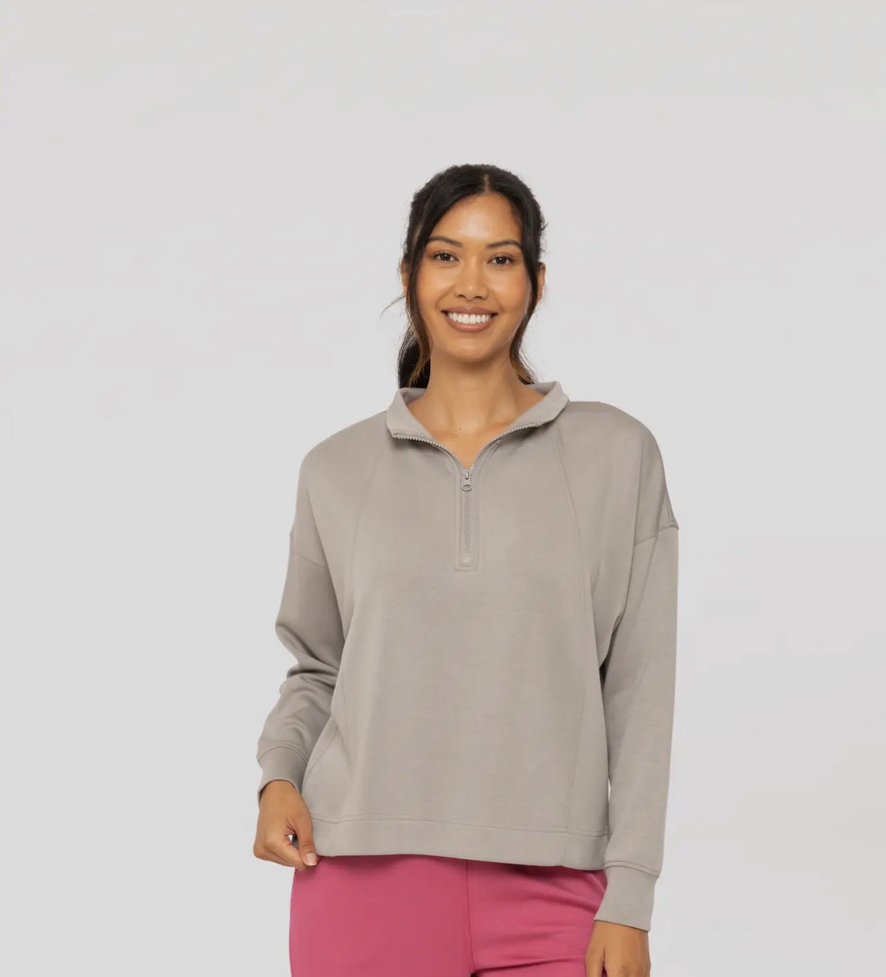 Meet your new go-to layer. This lightweight pullover is designed for both performance and style, featuring our bestseller scuba fabric that moves with you. The drop shoulder design offers a relaxed fit, while the princess seam detailing down the front adds a touch of feminine flair. Whether you're heading to the gym or out for a casual day, this pullover blends versatility and chic appeal.