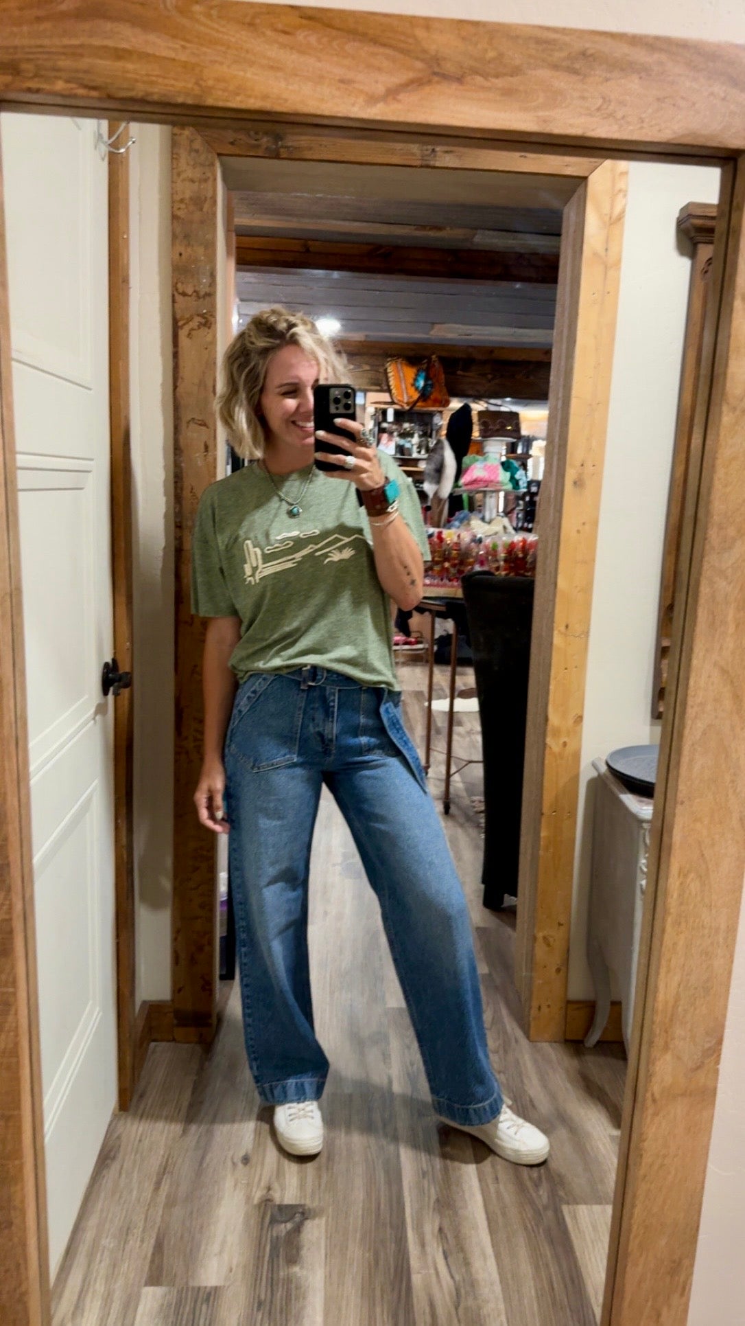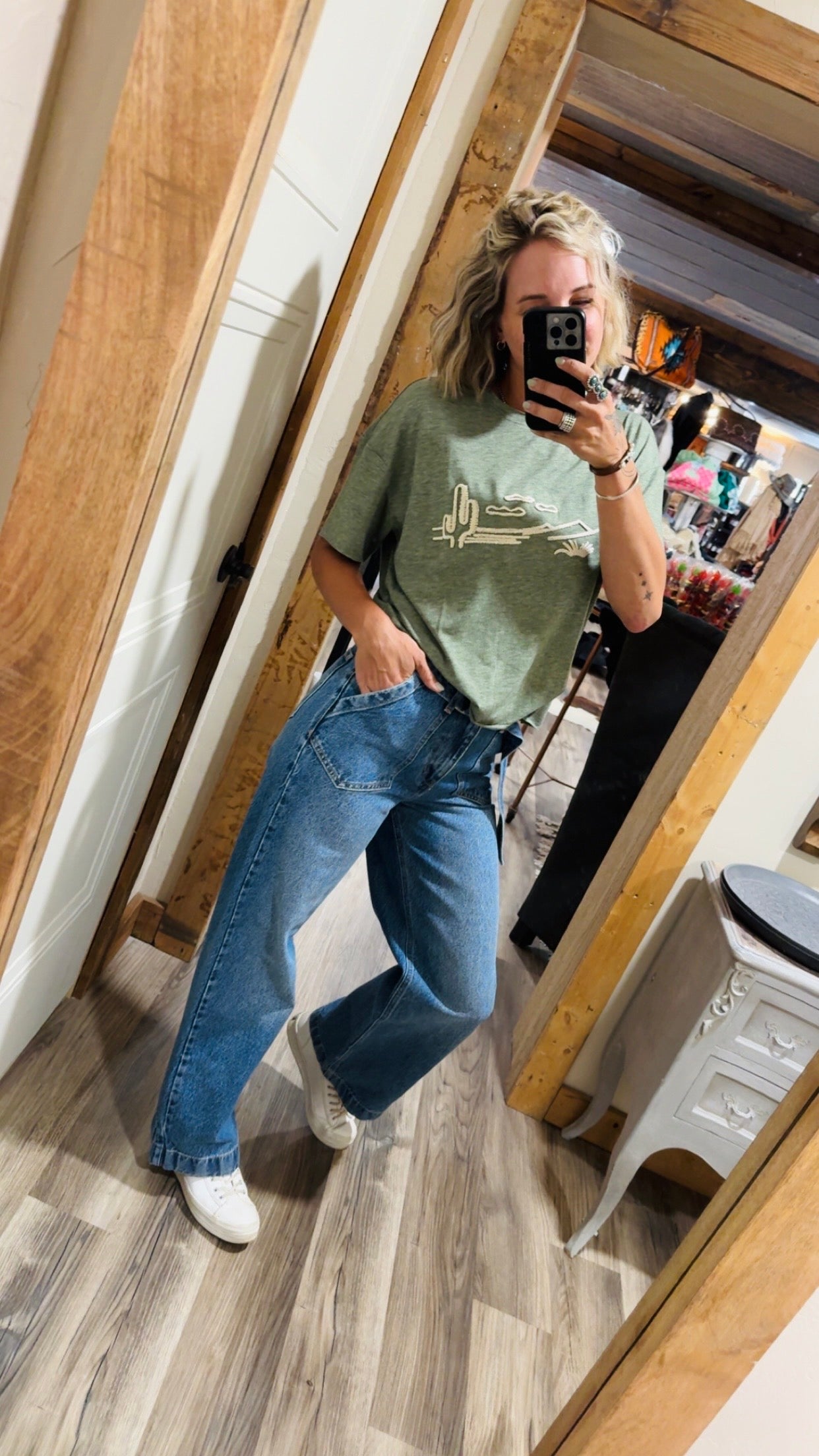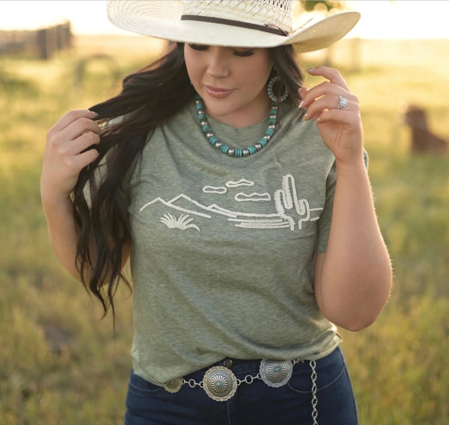 Ranch girl dreams cream on olive graphic Tee.