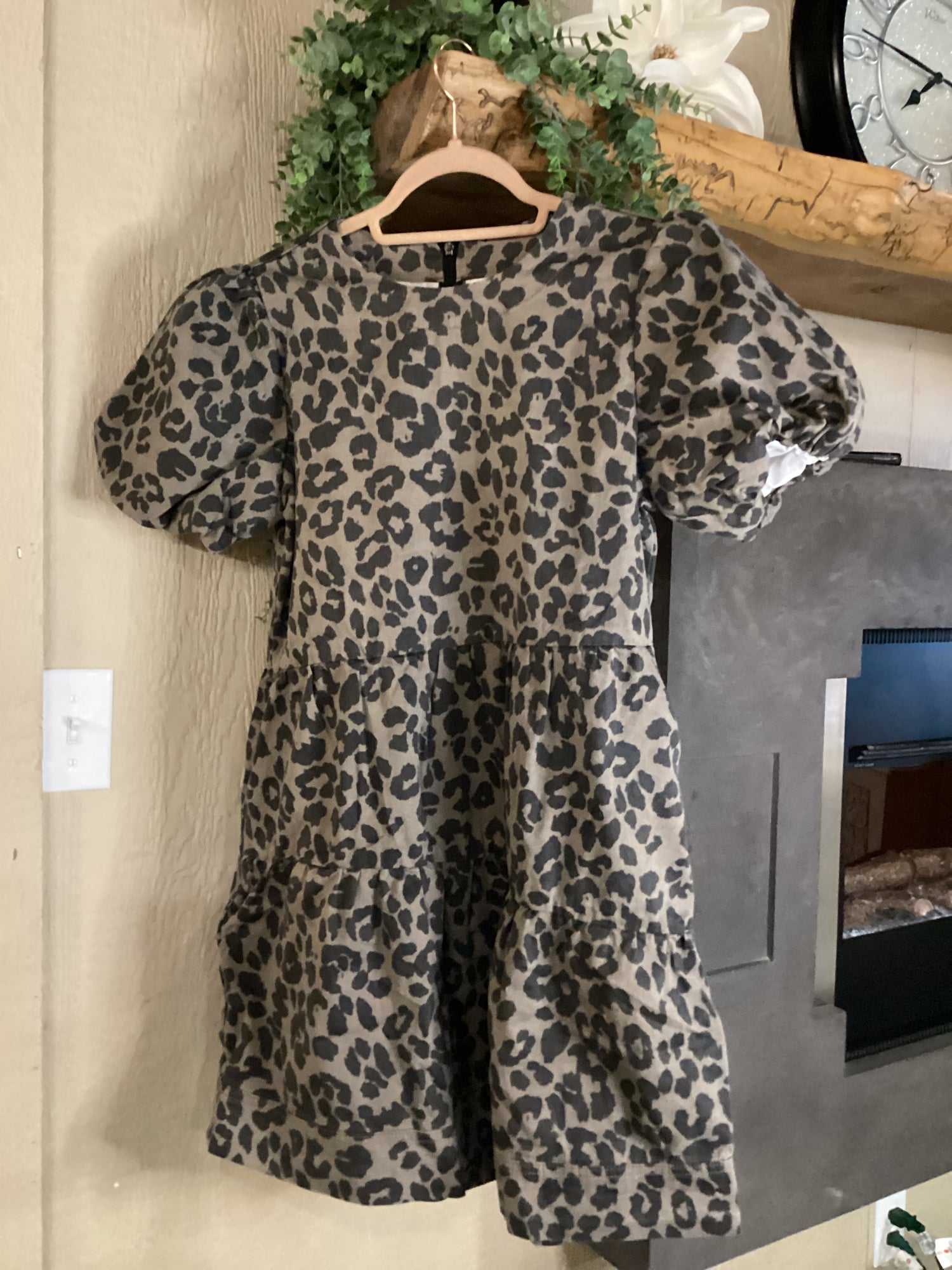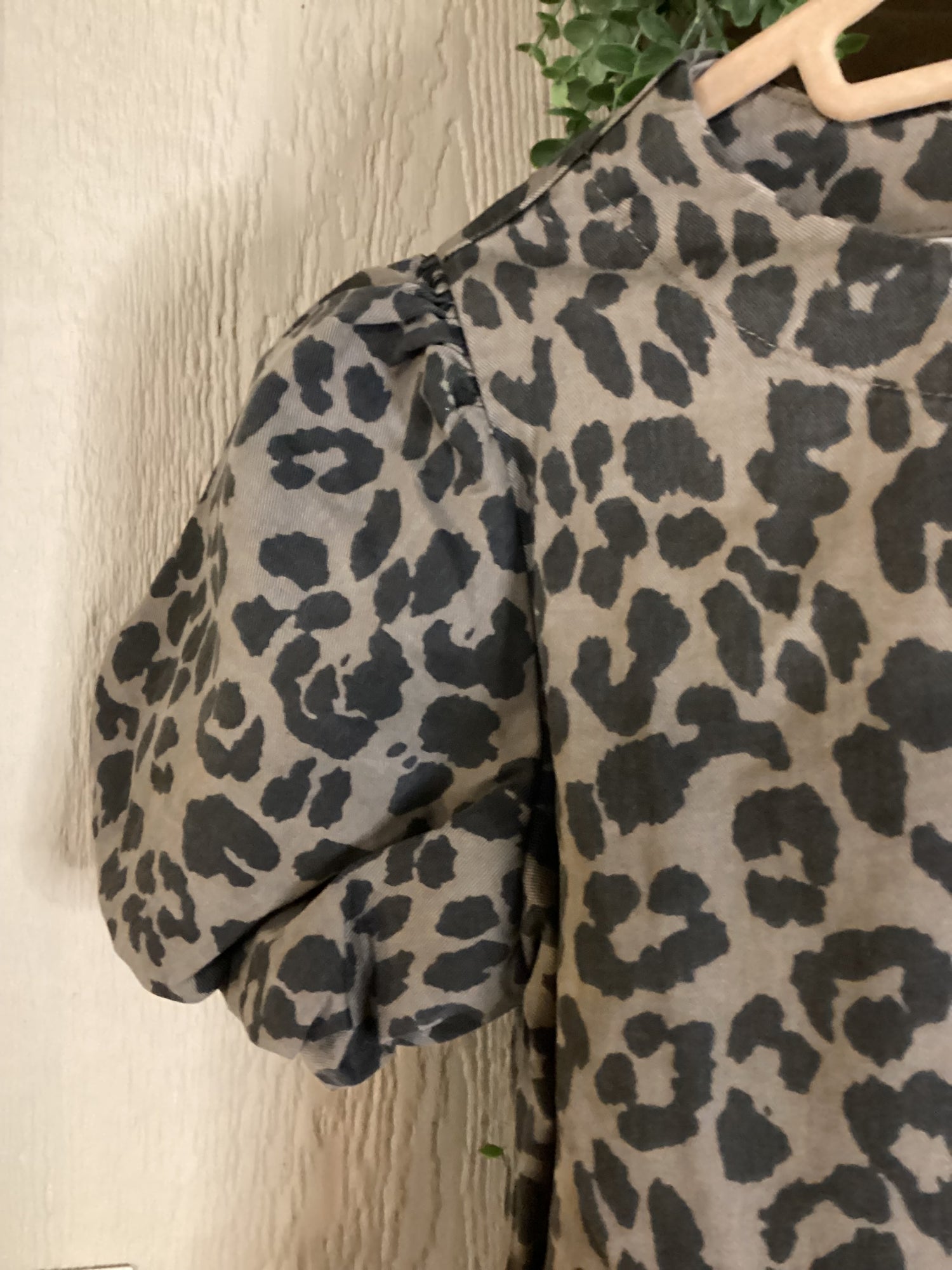 Brown Denim Leopard Short Puff Sleeve Mini Dress