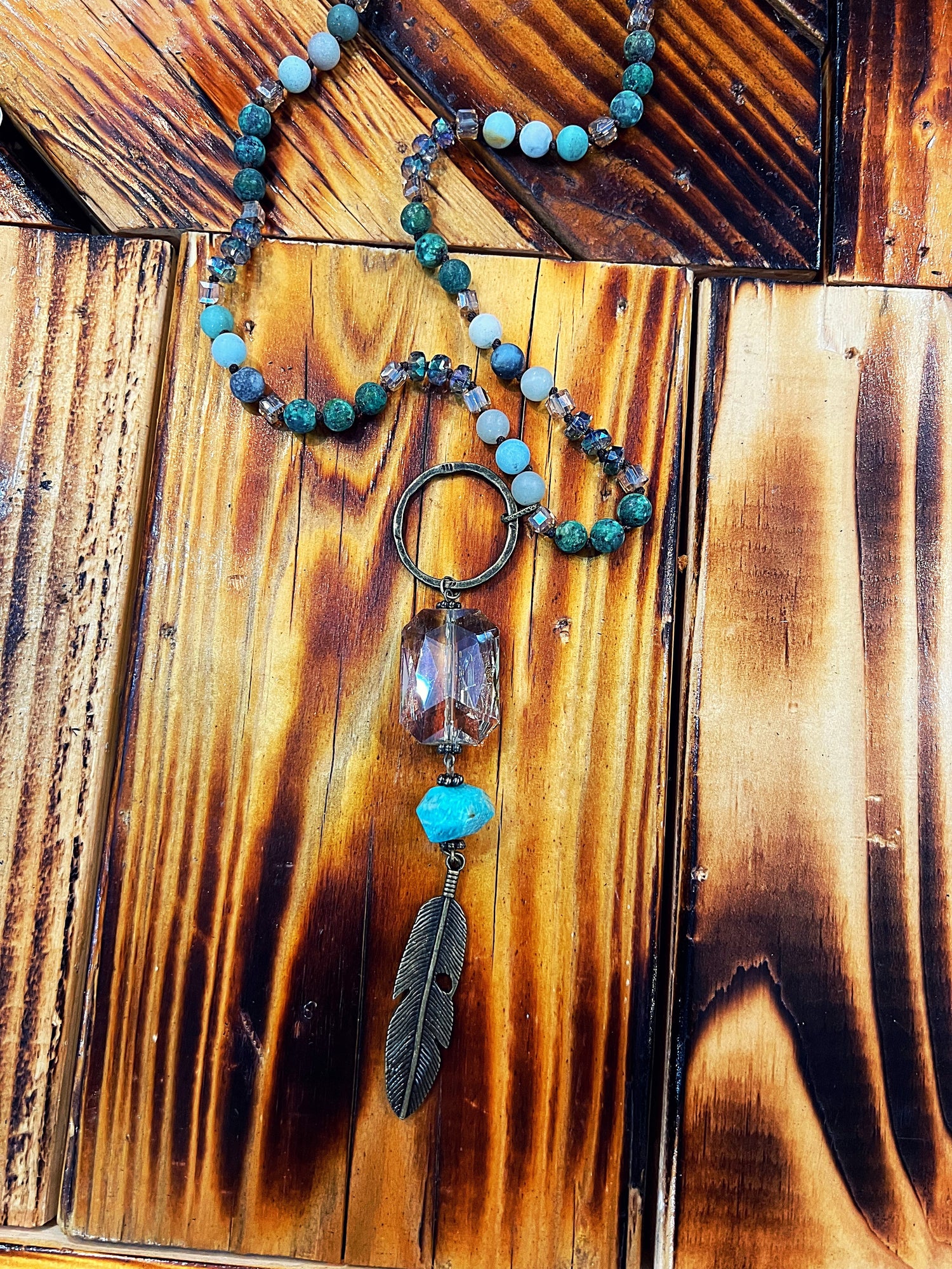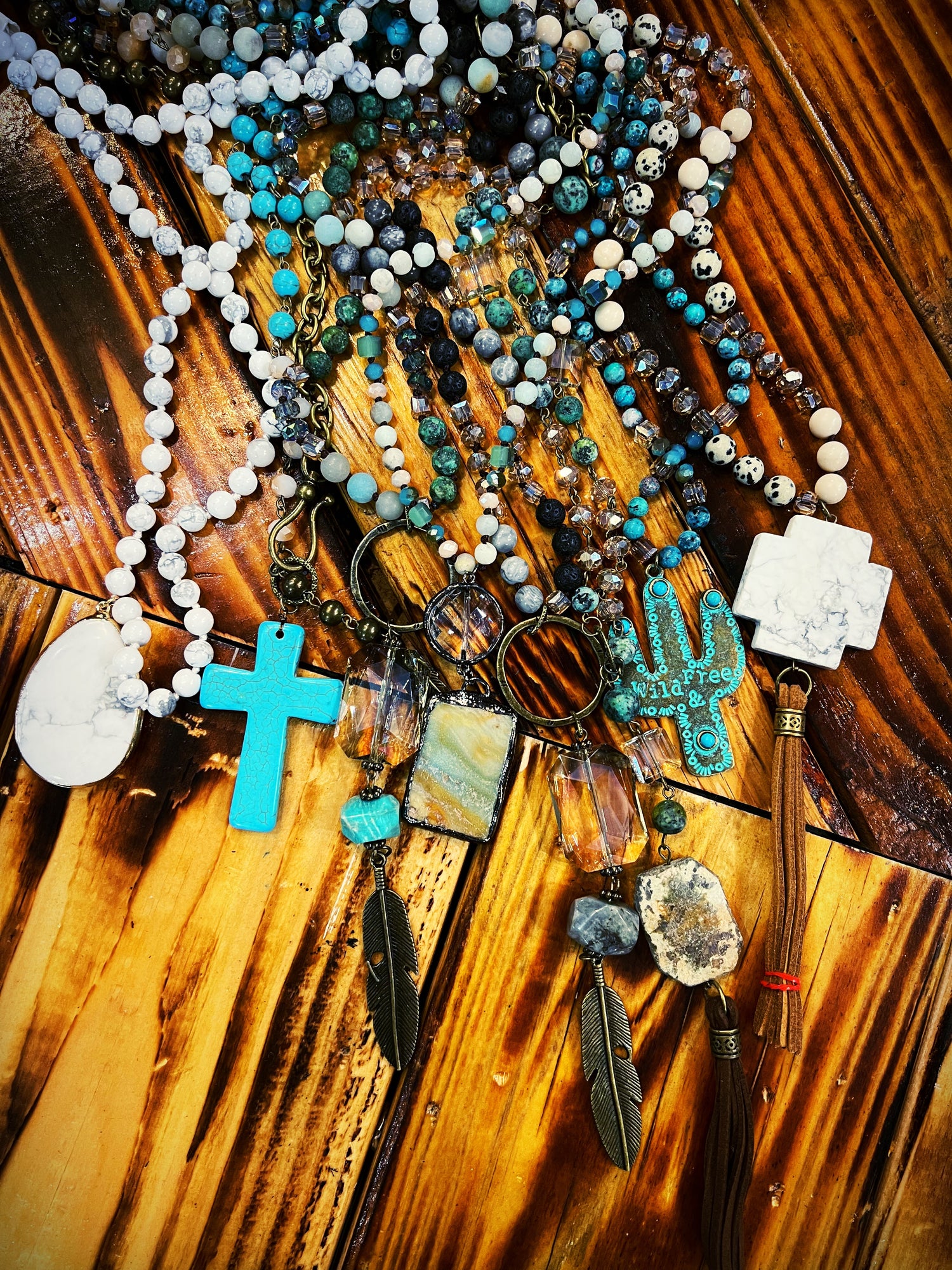 Several styles of needed necklaces to dress up an outfit. Dressy or casual. They look good with anything. Made of stone. Not a cheap plastic.