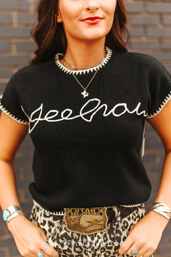 Ride into the season with bold Western flair in this “Yeehaw” embroidered black knit top, perfect for trend-forward cowgirls and boutique retailers. This eye-catching black cap sleeve knit top makes a powerful statement with its contrast white chain-stitch embroidery that boldly spells out Yeehaw across the front. The cream whipstitch detailing at the neckline, sleeves, and curved hem adds an artisan Western touch that sets this piece apart. Crafted in a soft, mid-weight knit with slight stretch, it offers both comfort and standout style for casual layering or statement solo wear. Styled here with a leopard skirt and a championship rodeo buckle, this graphic tee-style knit is ideal for Western fashion lovers who want to channel rodeo queen energy. Whether paired with flare jeans, suede fringe skirts, or high-waisted shorts, this piece transitions easily from day to night and is made to move with your customers from the arena to the after-party. Perfect for retailers looking to stock bold graphic Western tops with boutique appeal, this style is a best-seller in the making for Fall and beyond.