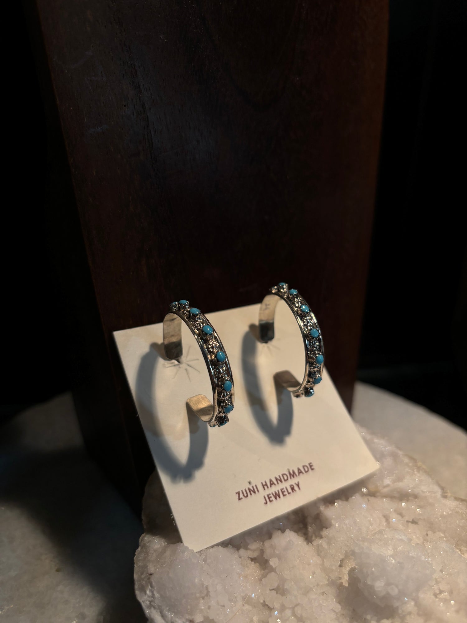 These sterling silver authentic earrings are a perfect staple piece for any outfit. Made with Kingman turquoise these earrings are sure to be a head turner!