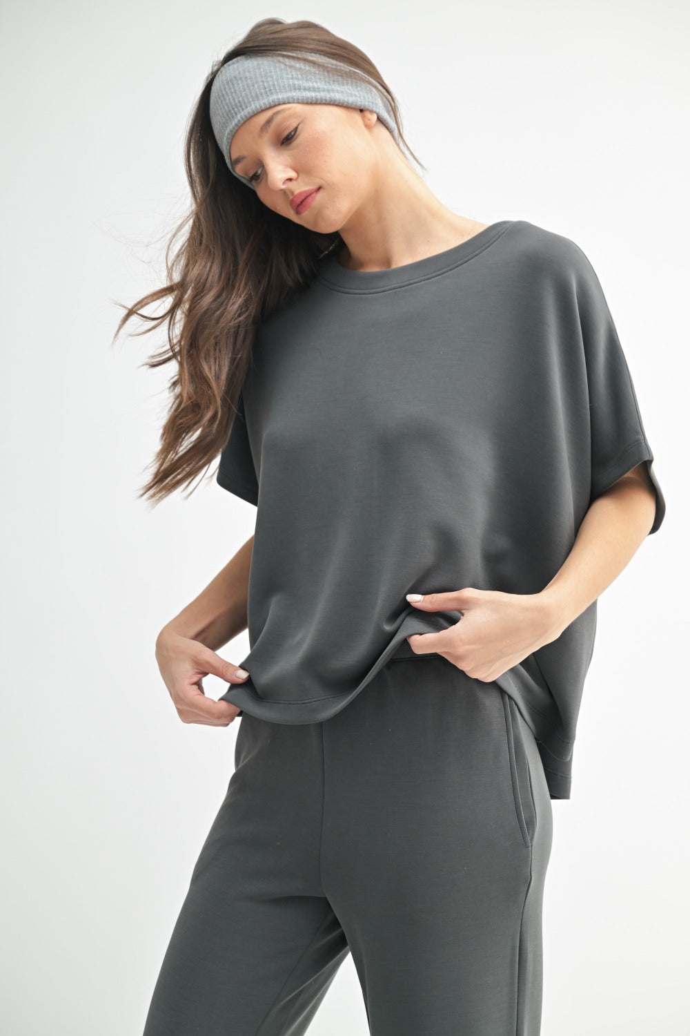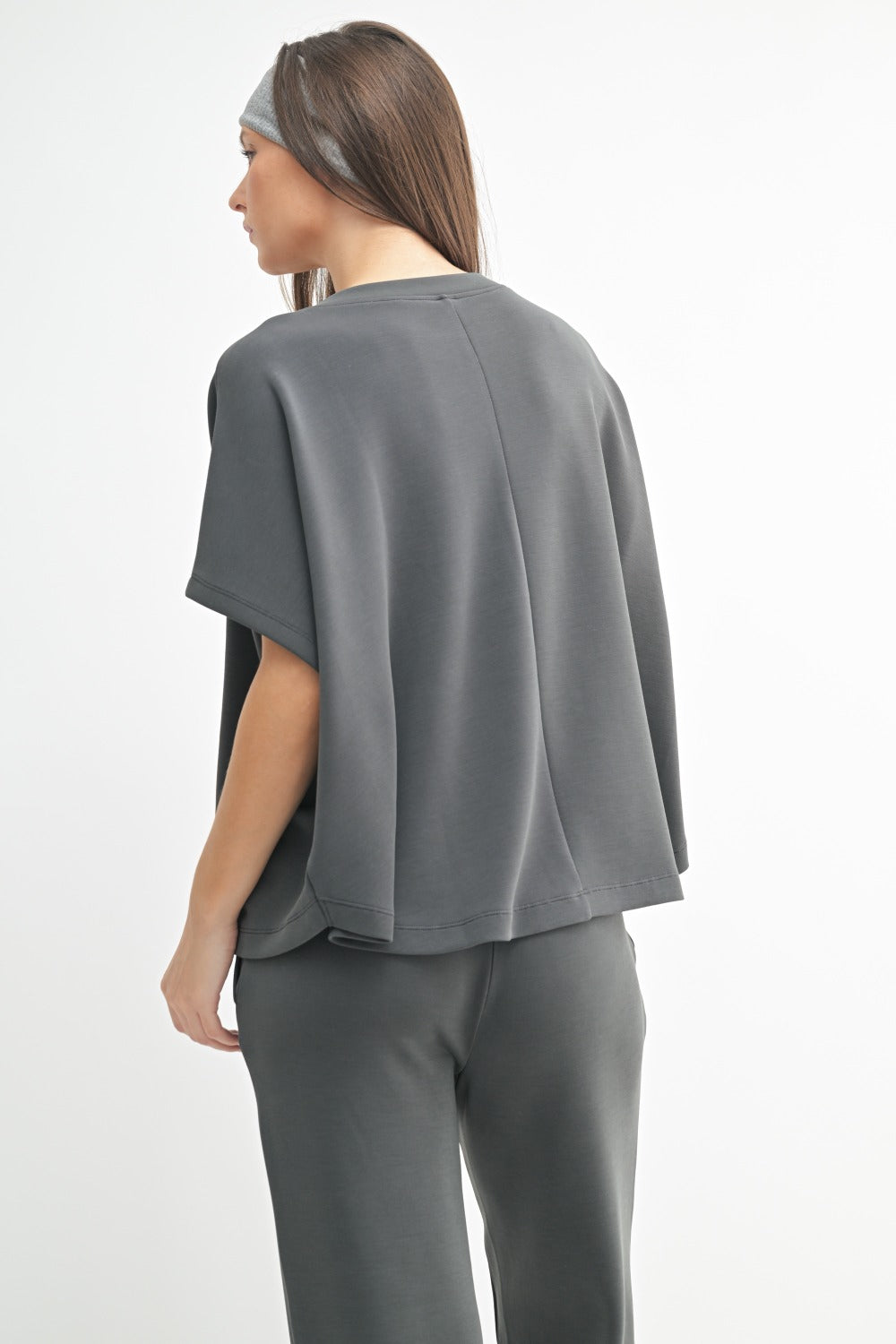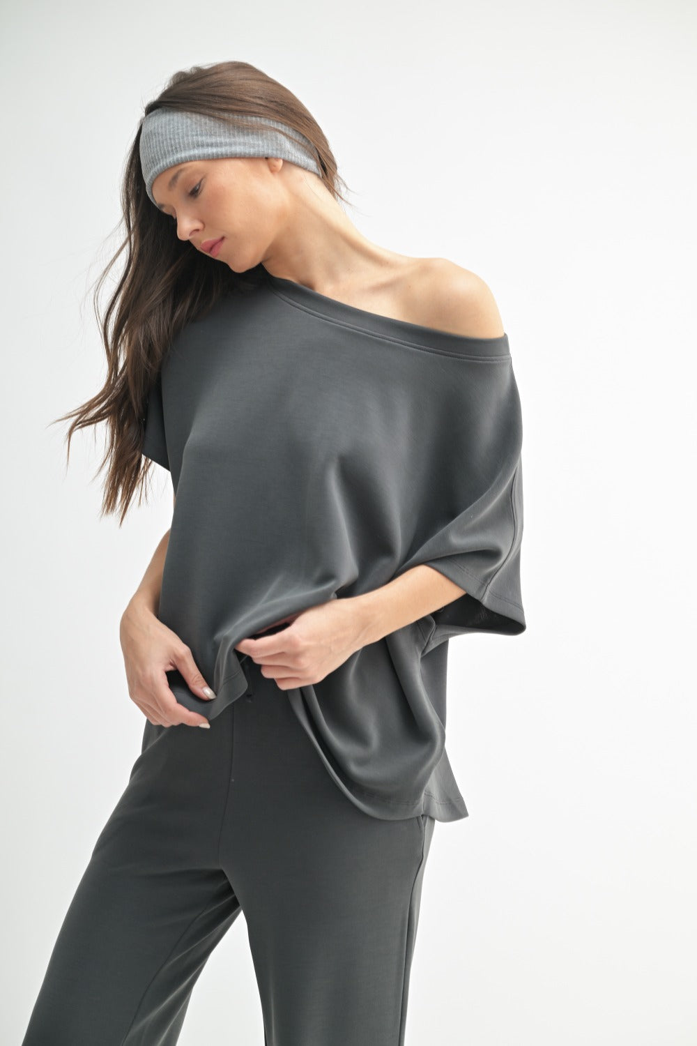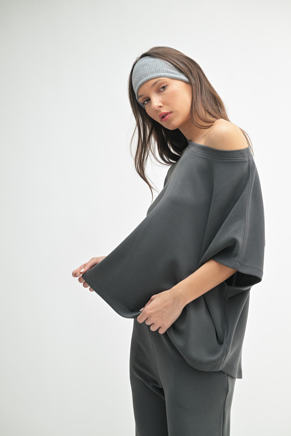 Lightweight and versatile, this top is your go-to for a polished yet comfortable outfit. Featuring a sophisticated boat neckline and dolman-shaped elbow-length sleeves, this airy top is perfect for crisp spring days. Its relaxed silhouette ensures ultimate comfort while maintaining an elegant vibe. Pair it with your favorite denim shorts for a casual look or match it with scuba pants or shorts for a coordinated style.