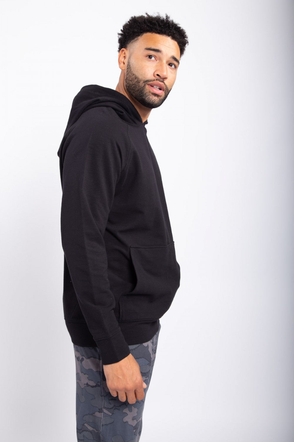 This raglan pullover hoodie features a split front pocket with a subtle stitch details, sleeves and bottom hem are cuffed.