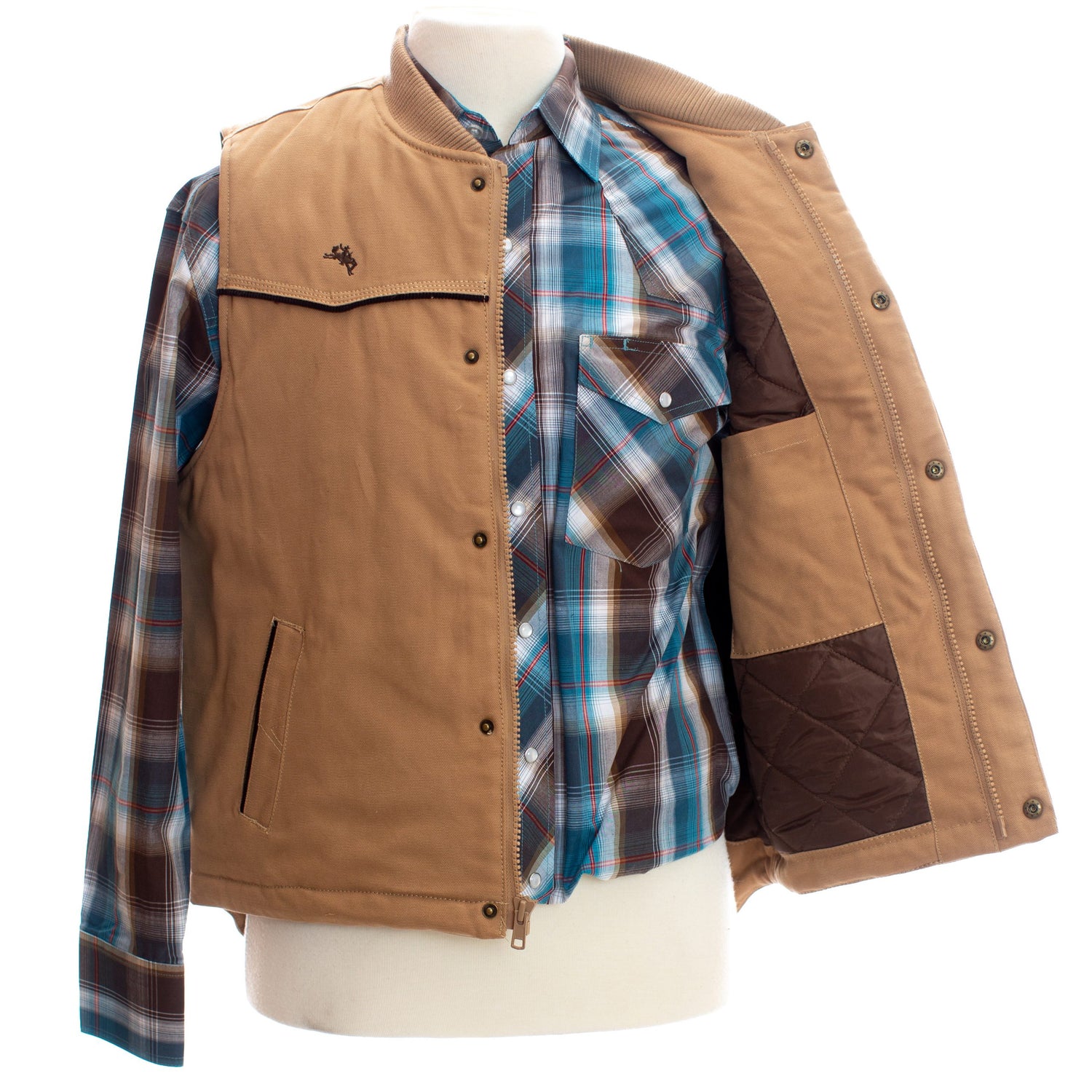 The Mountain Insulated Canvas Vest is made from our 12 Ounce Cotton Canvas and has a warm quilted satin lining for cool weather. The stitching is reinforced throughout and this vest as a ribbed knit collar. The corduroy detailed piping on the western yoke and hand pocket gives this vest a sharp look. Wyoming Traders logo snaps and two welt hand pockets lined with satin polyester are just a couple of the special details of our Mountain Vest. A durable YKK zipper and a drop back hem gives this vest the final touches of durability and comfort. The Mountain Insulated Canvas Vest is perfect for those chilly days when you need a little extra warmth.