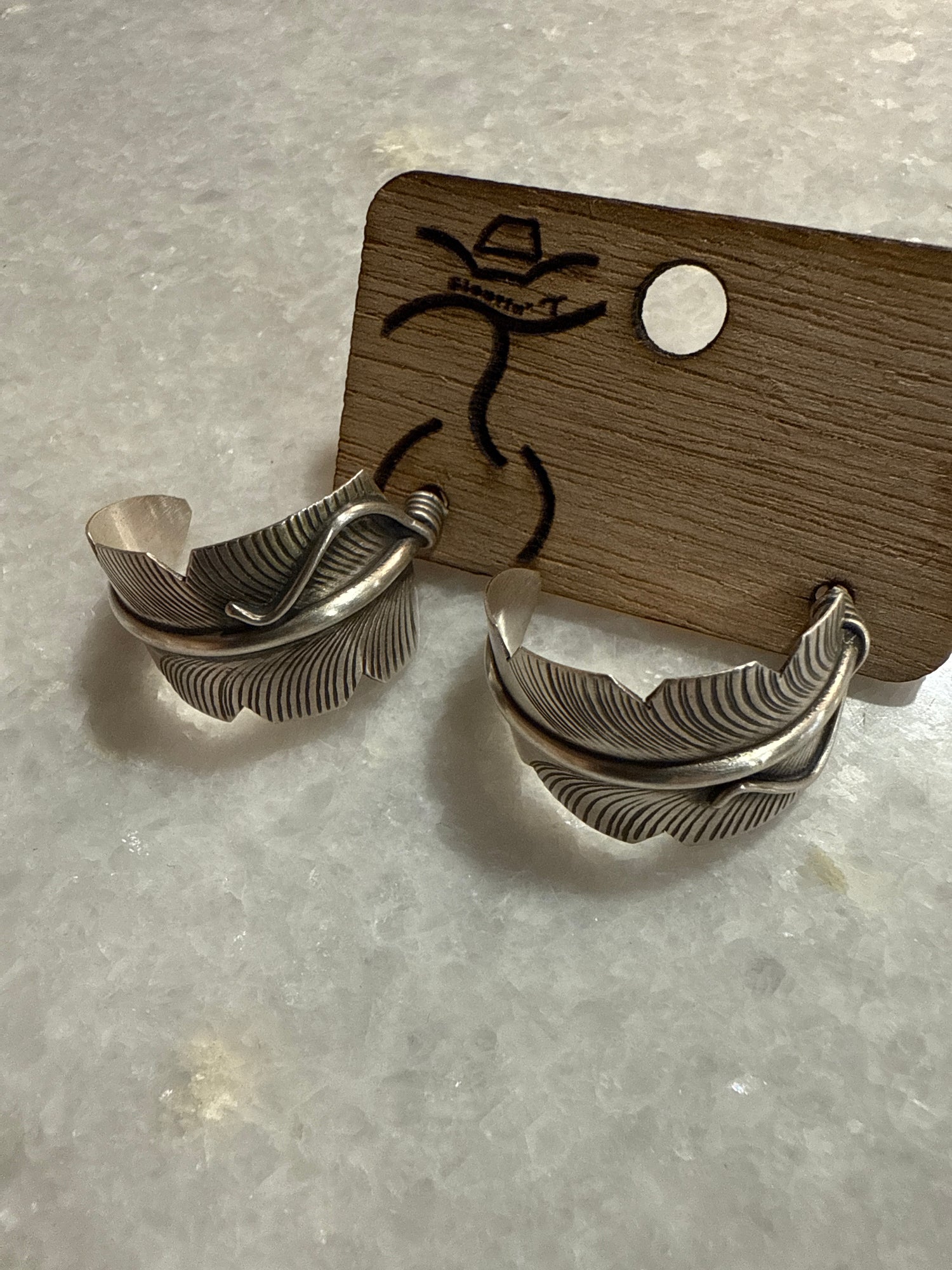 Navajo Handmade Marked CC Sterling Silver Feather Hoop Earrings