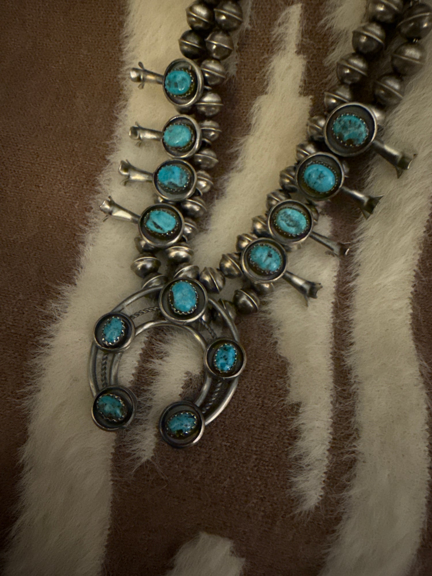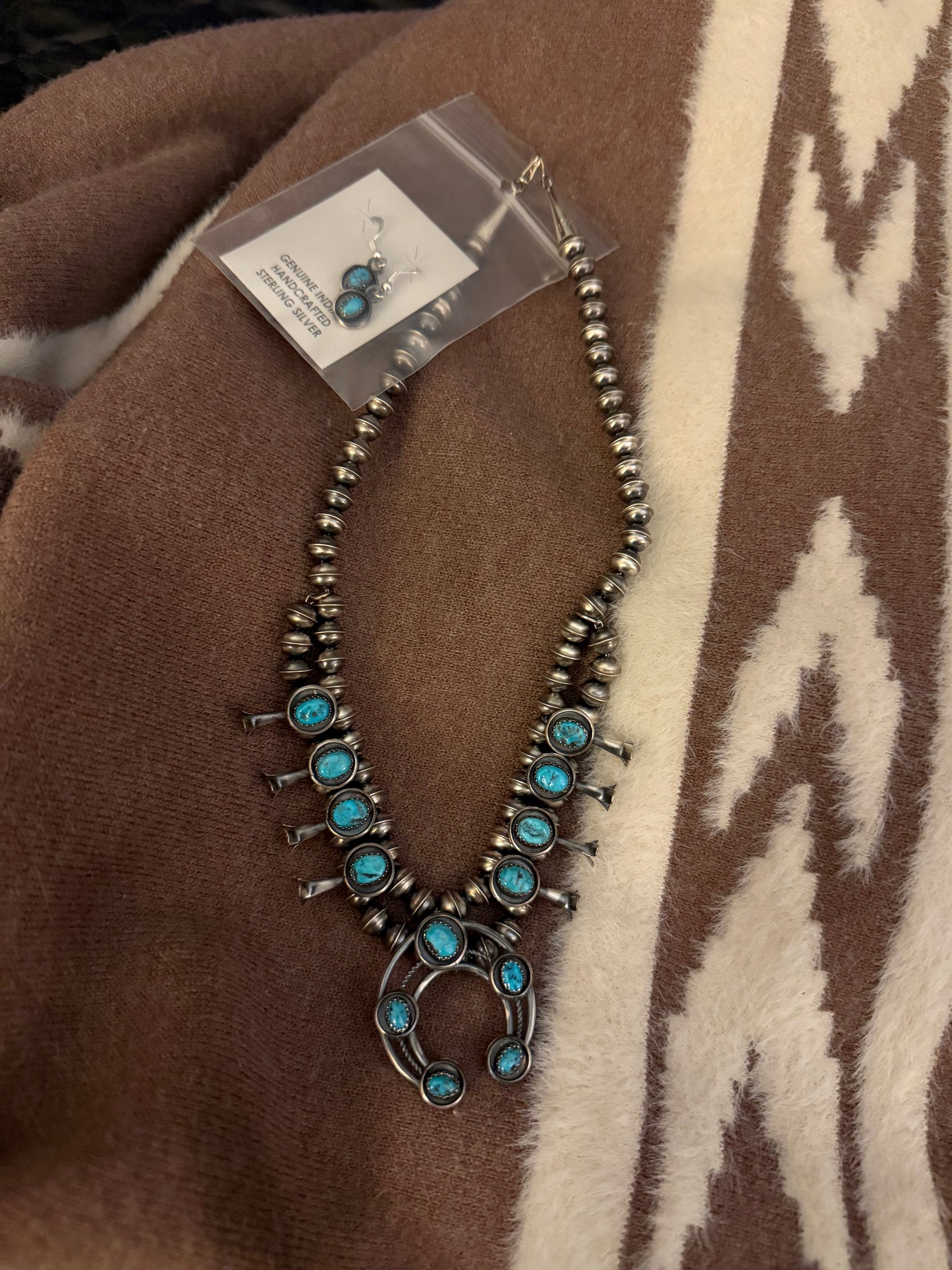 Signed Lenora Garcia Sterling Silver, Kingman Turquoise squash blossom necklace with matching earrings
