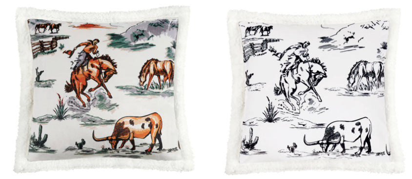 Capturing the essence of ranch life with its timeless motifs of Old West scenery, grazing herds, and brave cowboys in retro-inspired hues, the Ranch Life Western Toile Campfire Sherpa Pillow lets you bring rugged frontier charm into your space. This accent pillow’s soft sherpa construction and budget-friendly price make it an easy way to bring the spirit of the Old West into any space. Part of our best-selling Campfire line.