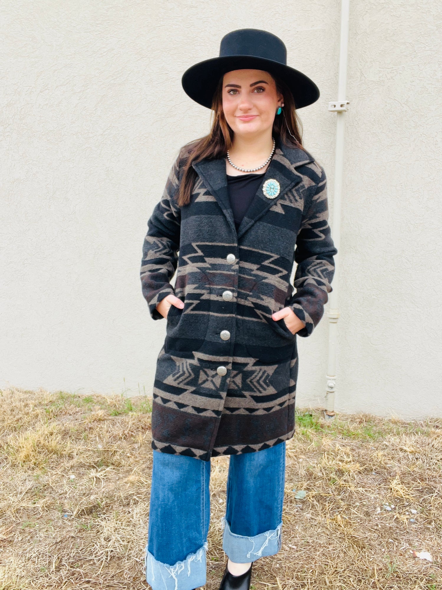 A slim fitting knee length coat with side panels for a shaped fit, in seam large front pockets & 4 concho button closure. Topstitch finish makes this a nice clean tailored look coat.