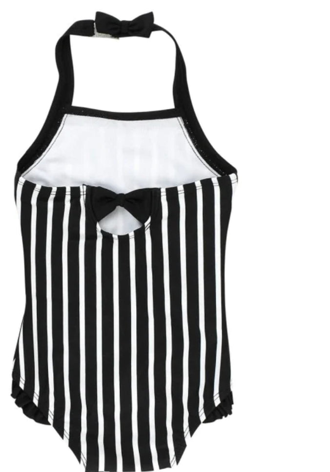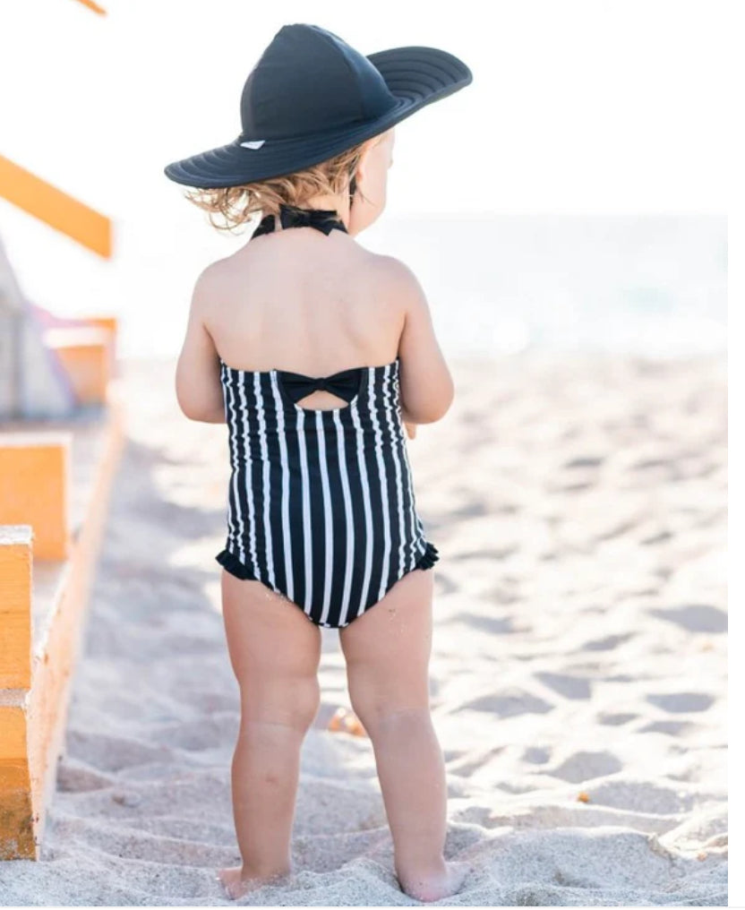 For a timeless look put your little one in our striped halter one piece. The UPF fabric will keep your little girl on trend and safe from rays.