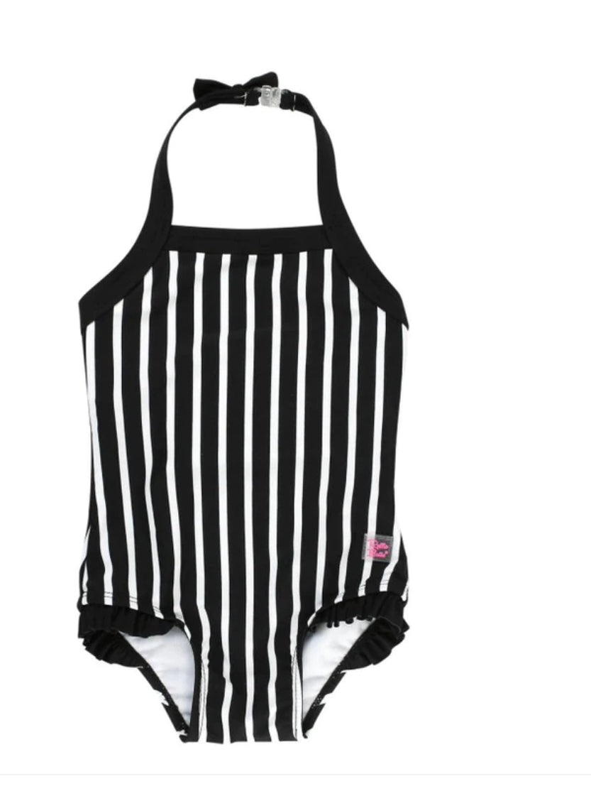 RuffleButts | Halter One Piece Swimsuit ~ Black and White 12-18m