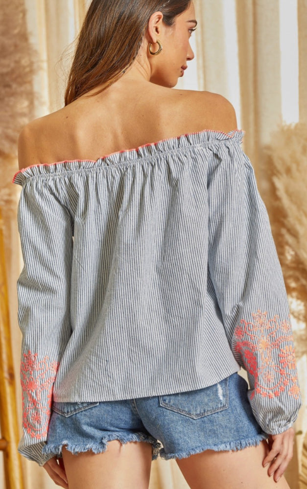 Striped off shoulder, top with embroidery accents on the sleeves, elastic cuffs and shoulder top.