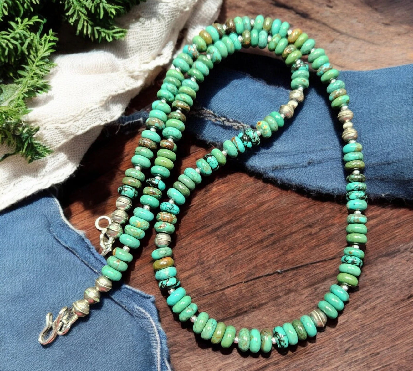 Hubei Turquoise and Navajo bench and saucer beads, traditional squash blossom Native American beads!!! It is finished with the traditional Navajo hook and eye clasp.