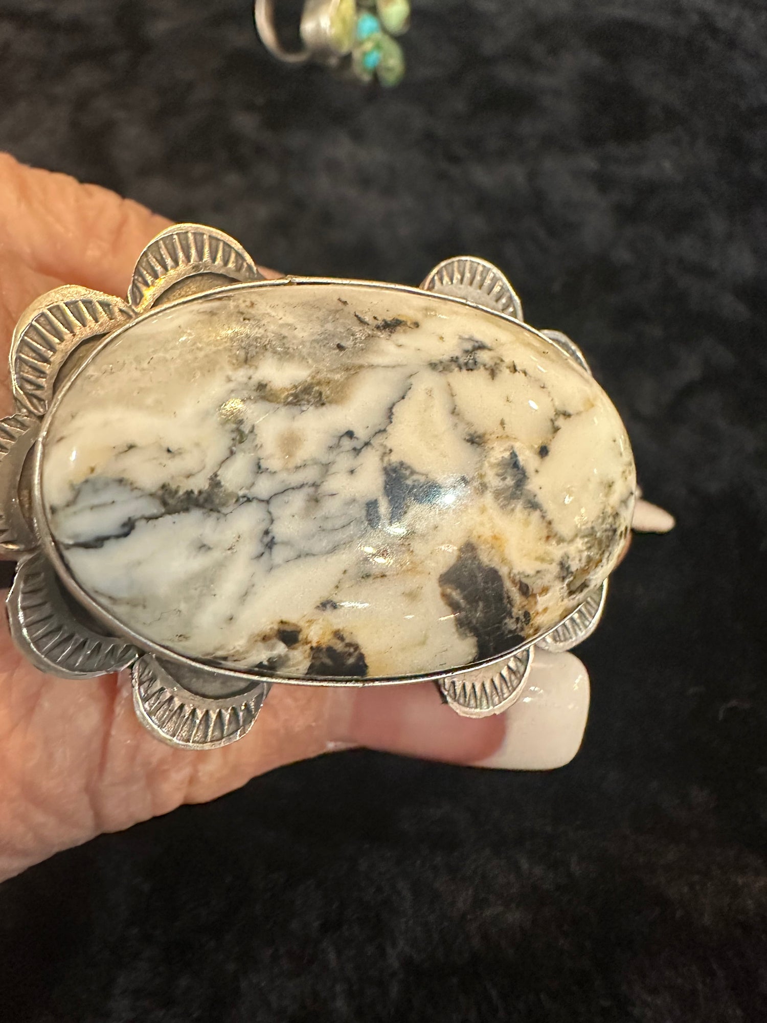 Sterling Silver White Buffalo Navajo Handmade Marked by Tia Long Adjustable Ring 2” long