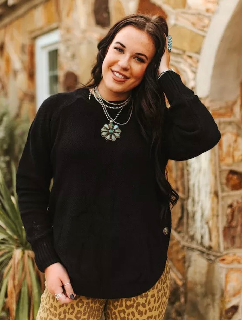 Cozy up in true western chic with this Lucky & Blessed black textured knit sweater — a versatile, staple for fall and winter collections. Designed with a relaxed fit, soft waffle knit fabric, and curved hem, it offers effortless comfort while maintaining a polished, timeless look. Subtle concho-style button accents add a touch of Western charm, making it perfect for styling with denim, cowgirl boots, or layered turquoise jewelry. Ideal for chilly days.