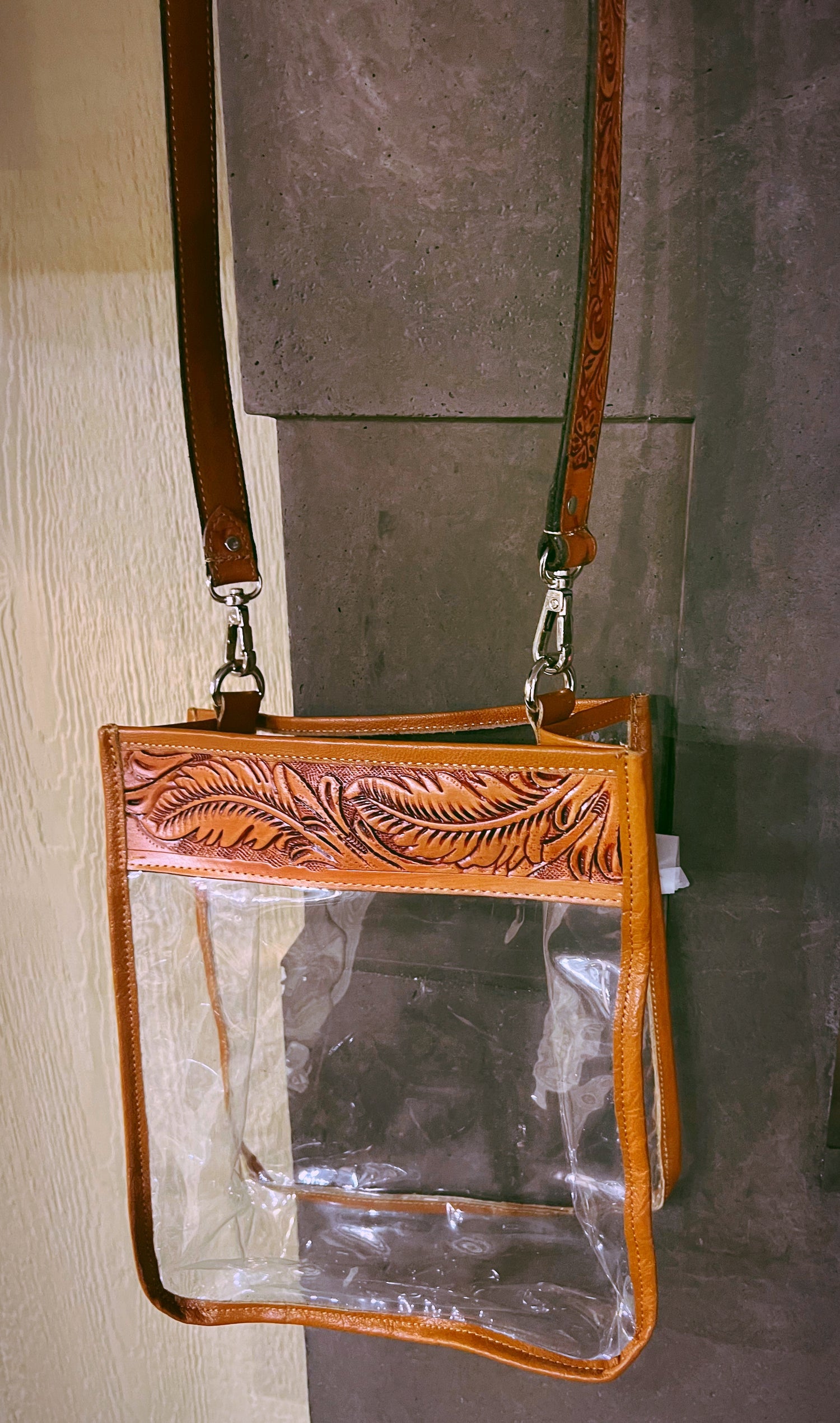 Myra clear purse with tooled leather accent for the times you are required to carry that clear bag. Spruce it up with this and still be in style.