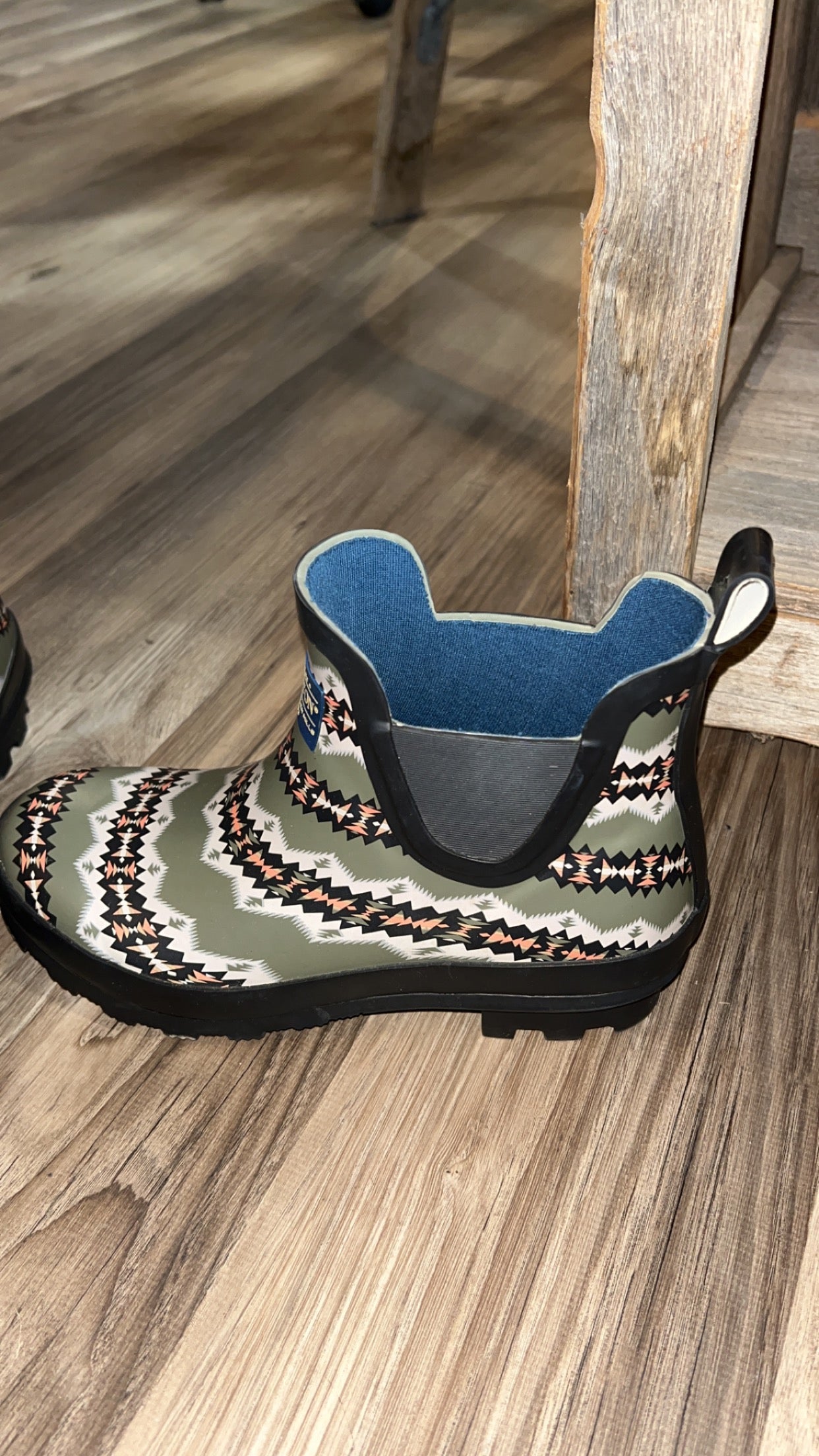Short Top Green and Peach Aztec Pendleton Rain Boots(Upper Rubber, Lining Polyester Nylon, and the Outsoles are Rubber.)