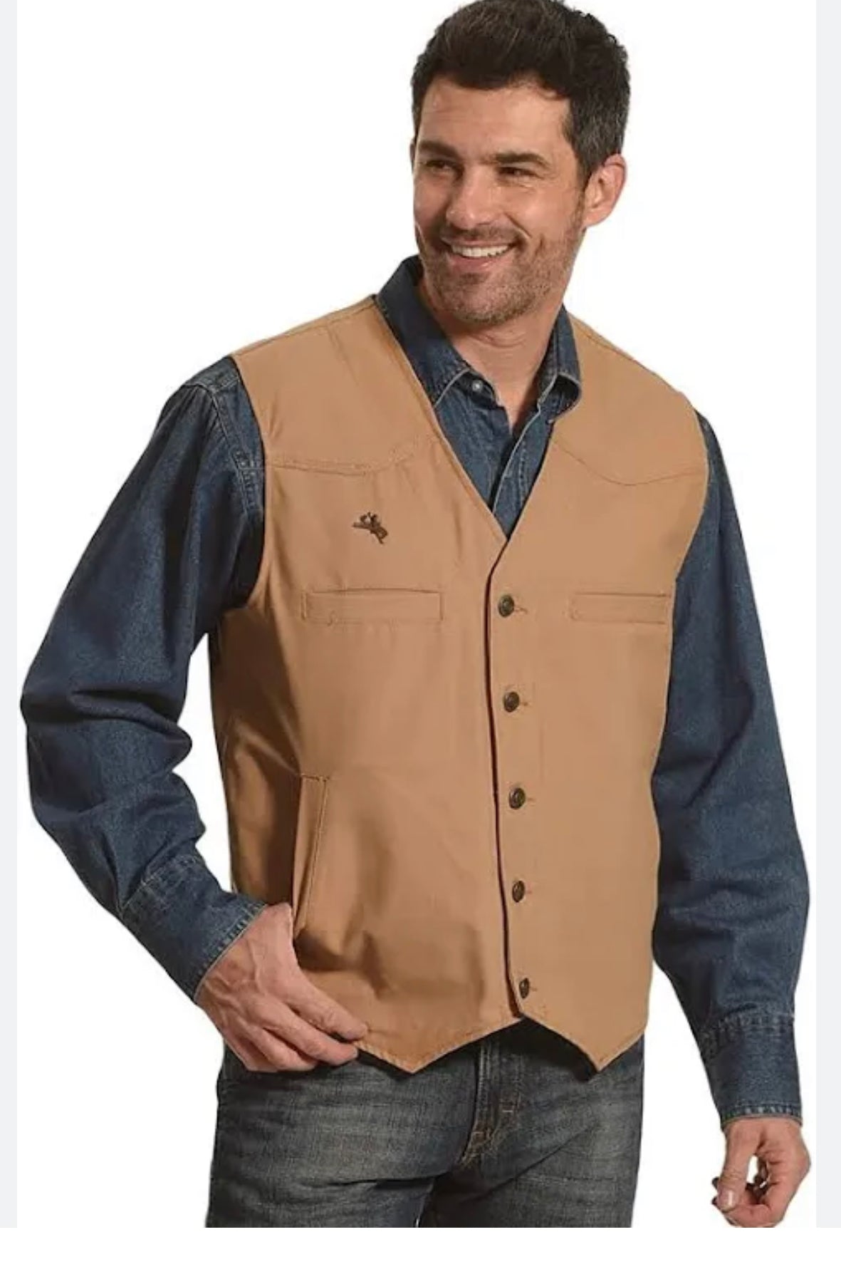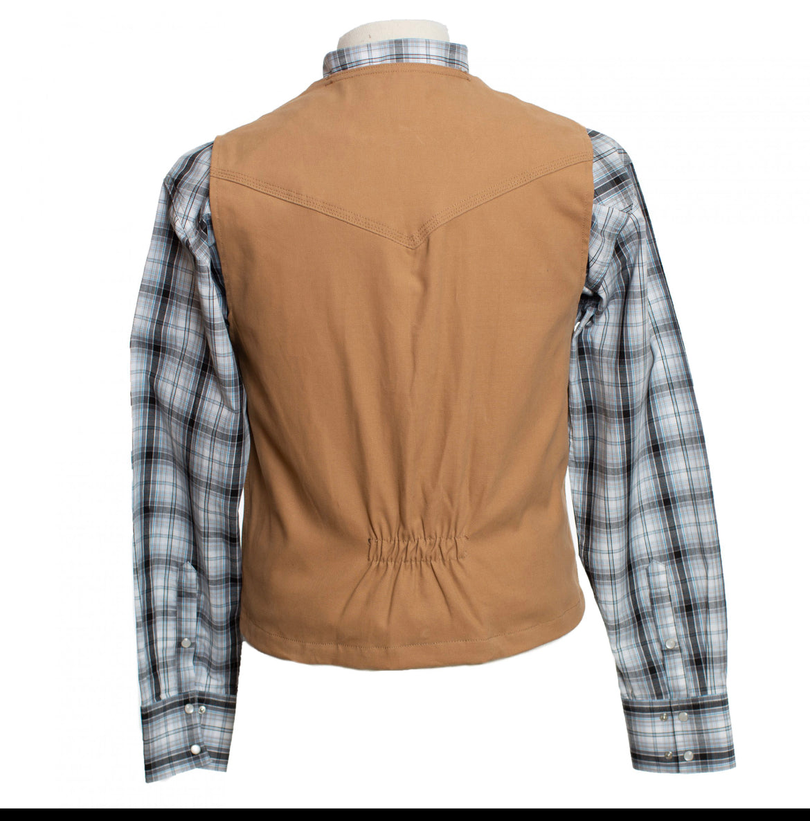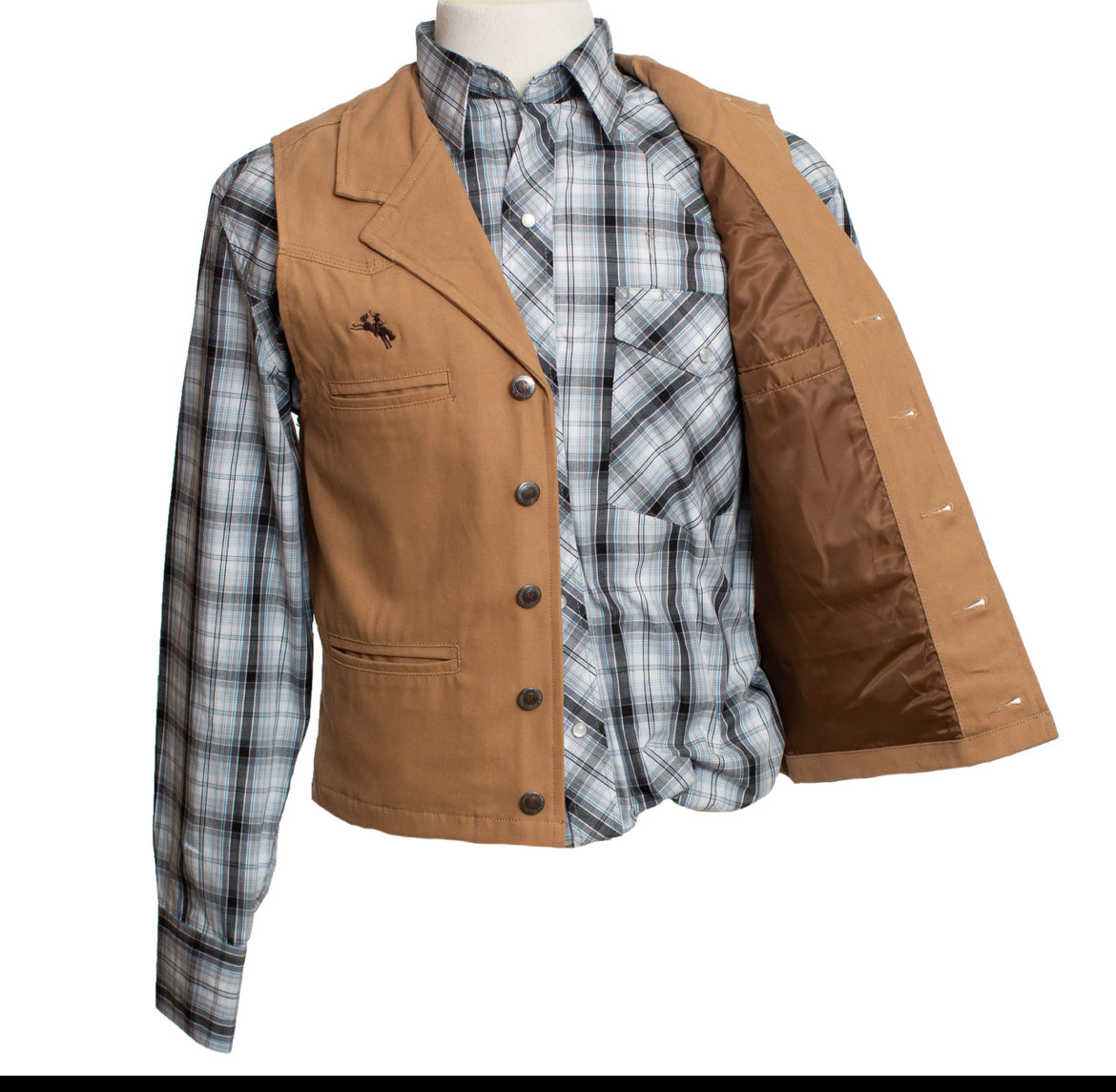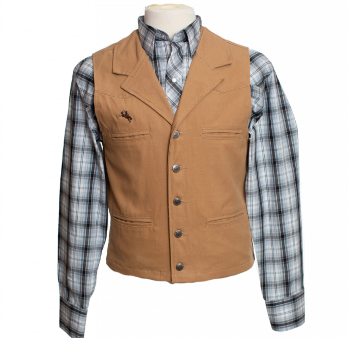 The Bronco Canvas Vest is the most popular canvas vest we have perfect for any farmer, rancher, cowboy, or anyone looking for a vest that looks stylish and is durable for any workday. With a western look and an adjustable back, the Bronco Vest comes in many different colors.