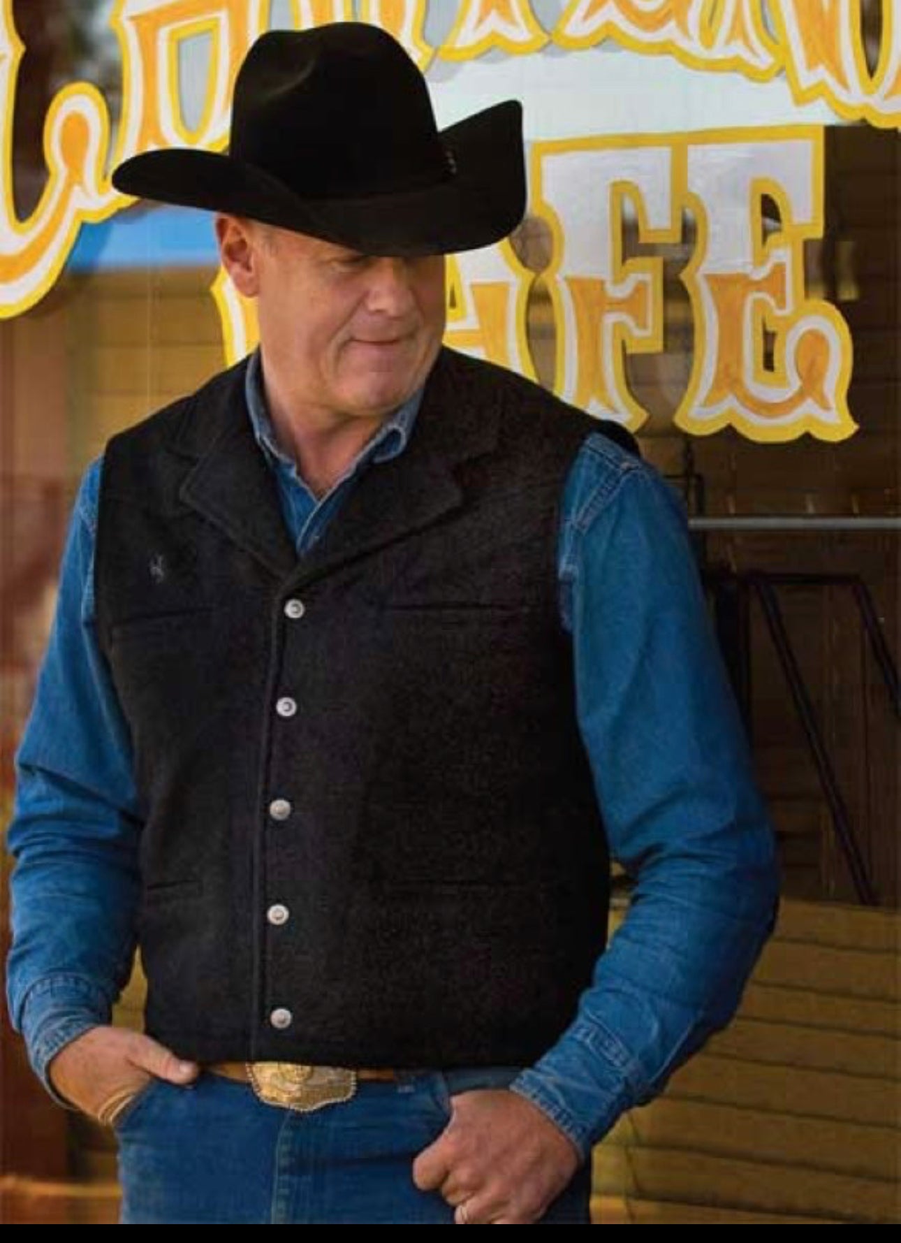 The Mens Buckaroo Wool Vest is made from our premium 22 Ounce Australian Wool and is naturally water resistant. This vest has the full western look with the shoulder western yoke, an lapel collar and five Wyoming Traders logo buttons. This vest is lined with a polyester satin lining and has two inside wallet pockets. The Buckaroo Wool Vest has four nice looking front welt pockets, two for your hands and two chest pockets and all lining with satin. Dry Clean Only.