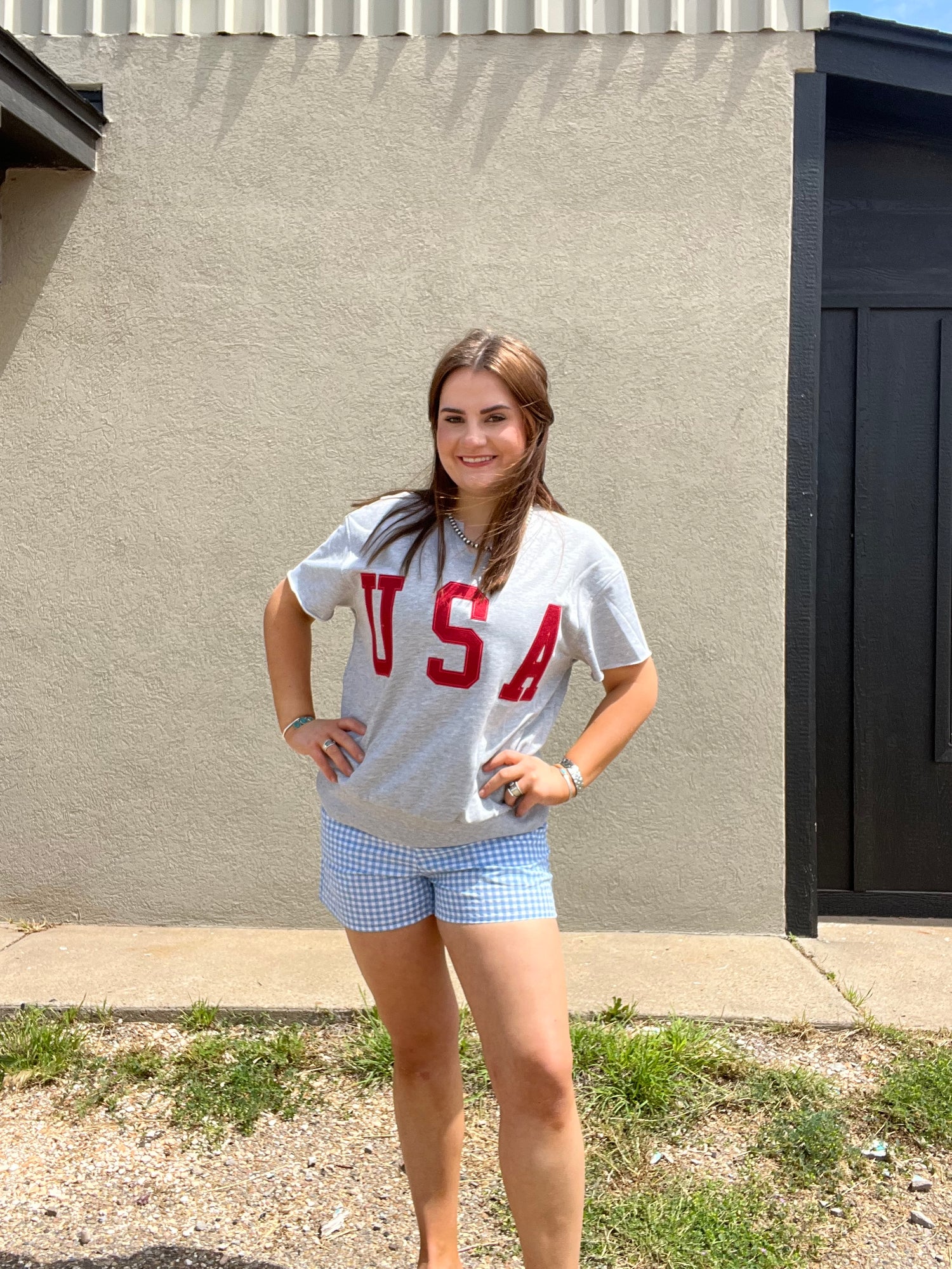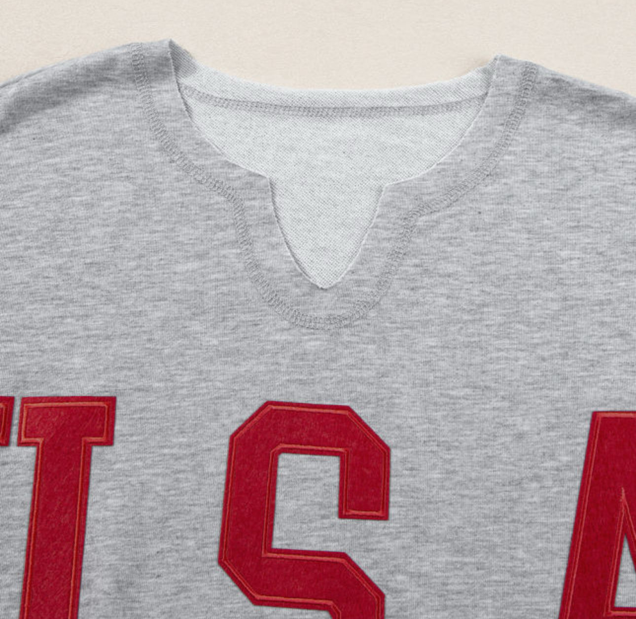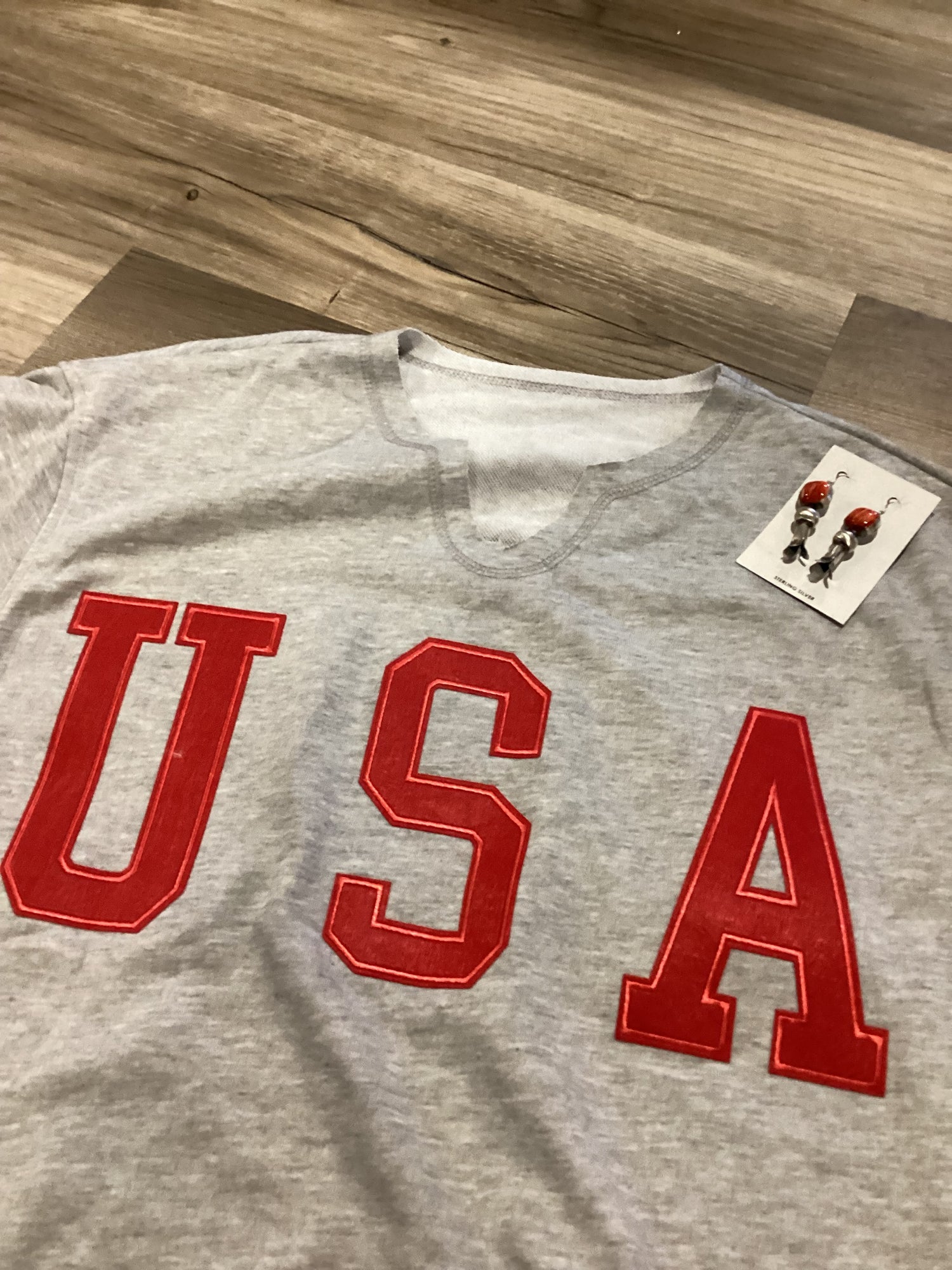 Soft material, with a cutout v-neck line to add detail. USA stitched red letters.