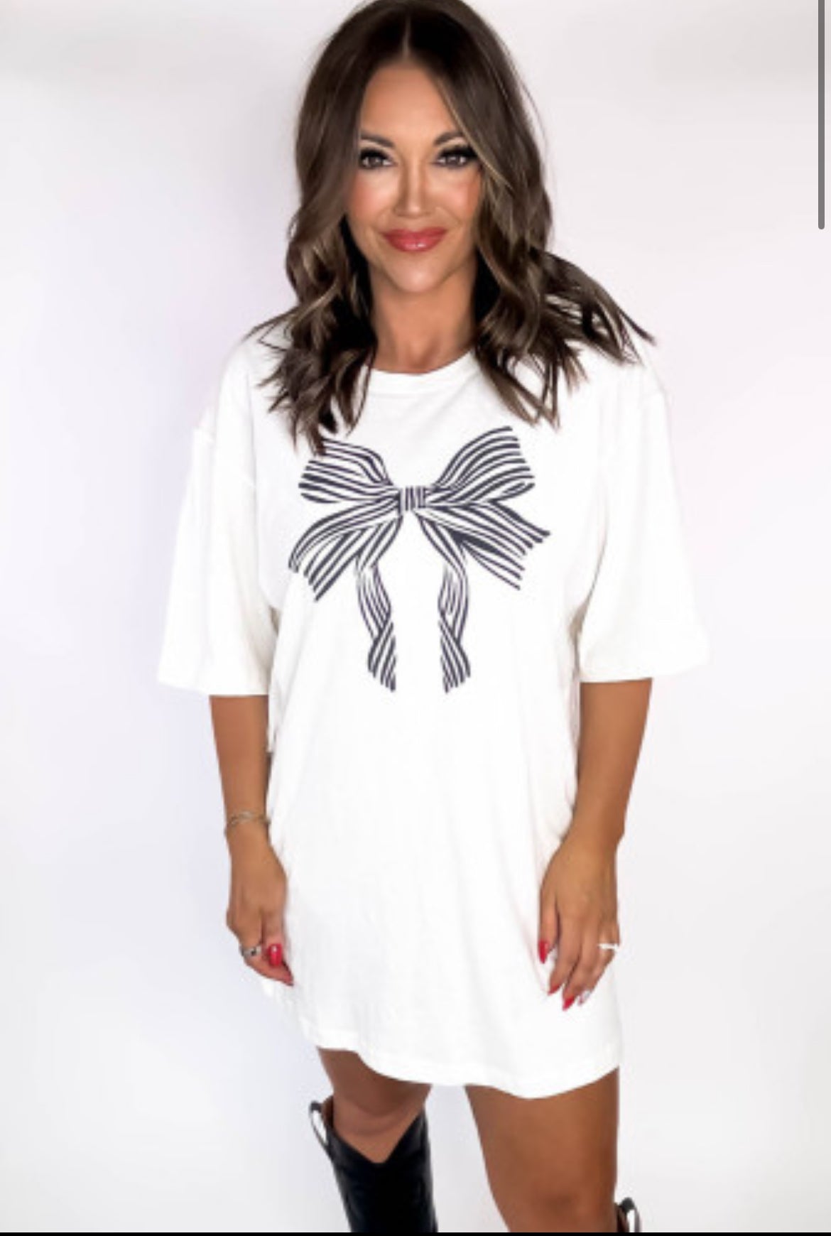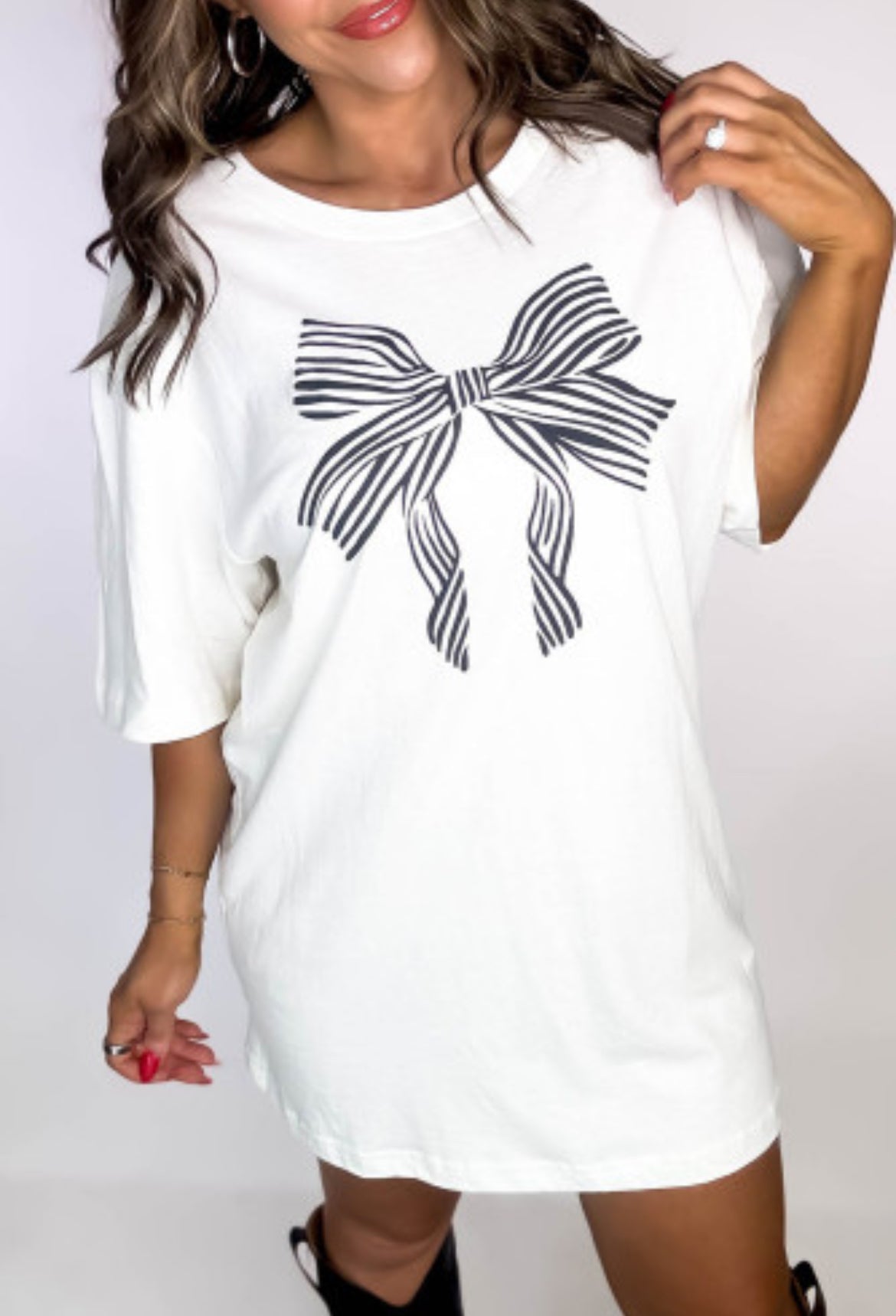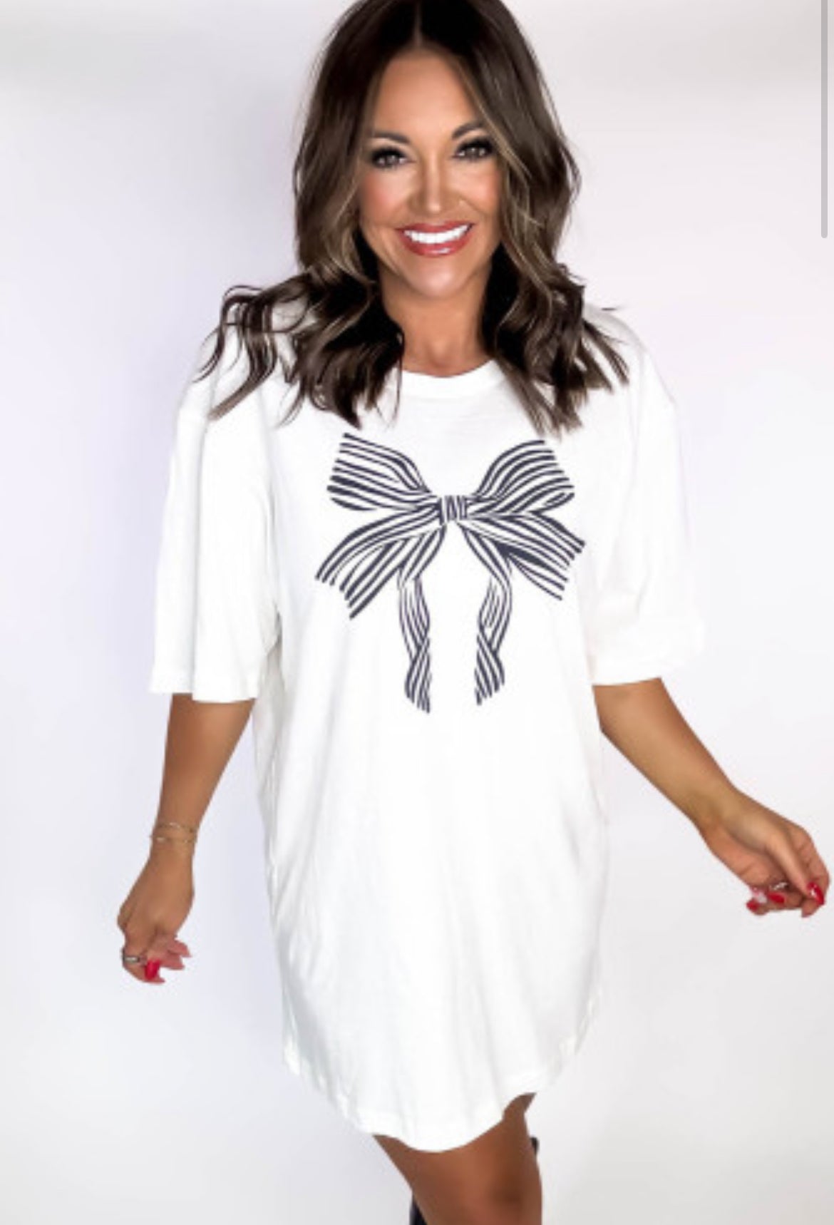 White Striped Bow Knot Half Sleeve Tunic T Shirt