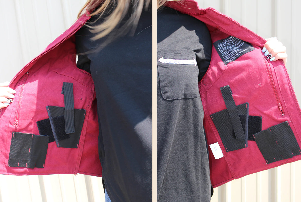 The Women’s Calamity Conceal Carry Vest is a lightweight vest made with our 100% cotton canvas. With a built-up collar, durable YKK zipper and reinforced stitching though out, this vest has two pistol holster and four magazine holders with removable imprint pad. The Calamity has an elastic back waist and two front hand pockets.