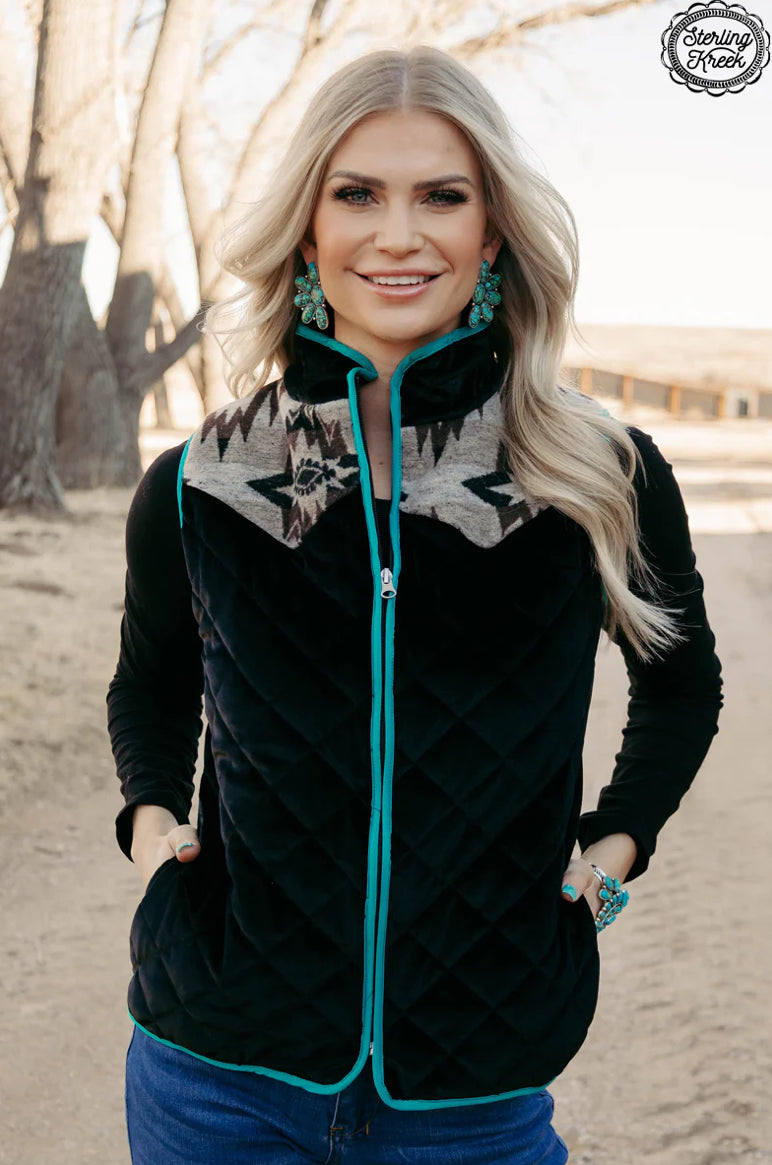 Snag some style points with this Zip Me Up Vest! The black velvet quilted fabric provides a luxe touch, while the Aztec print on the shoulders and bright turquoise lining give it an eye-catching pop. Zip up for a night on the town that'll have 'em saying "Whoa!" (in the best way possible).
